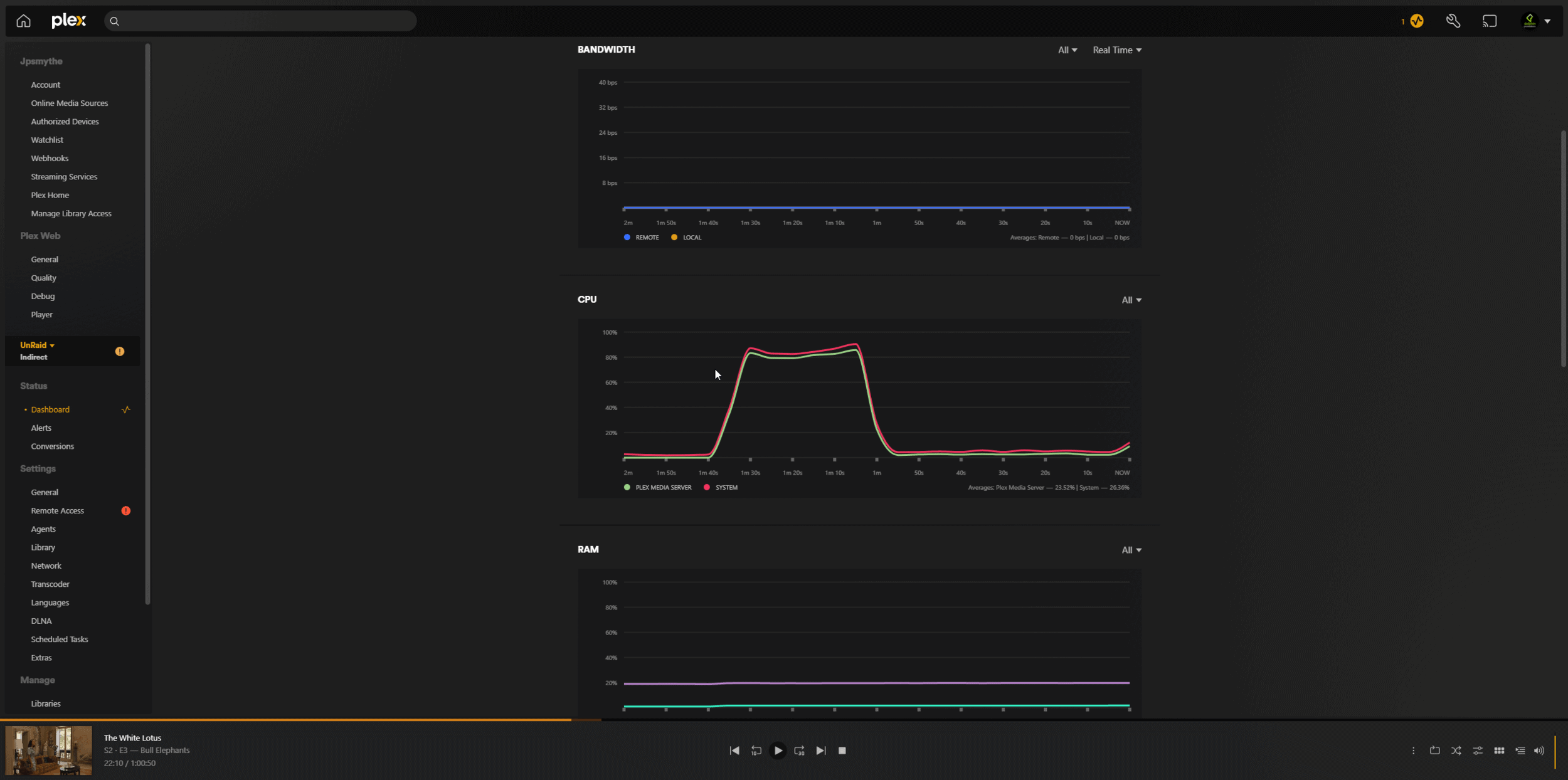 - Plex Dashboard: This gives a real-time view of current streams, including whether they’re being transcoded, direct played, or direct streamed.