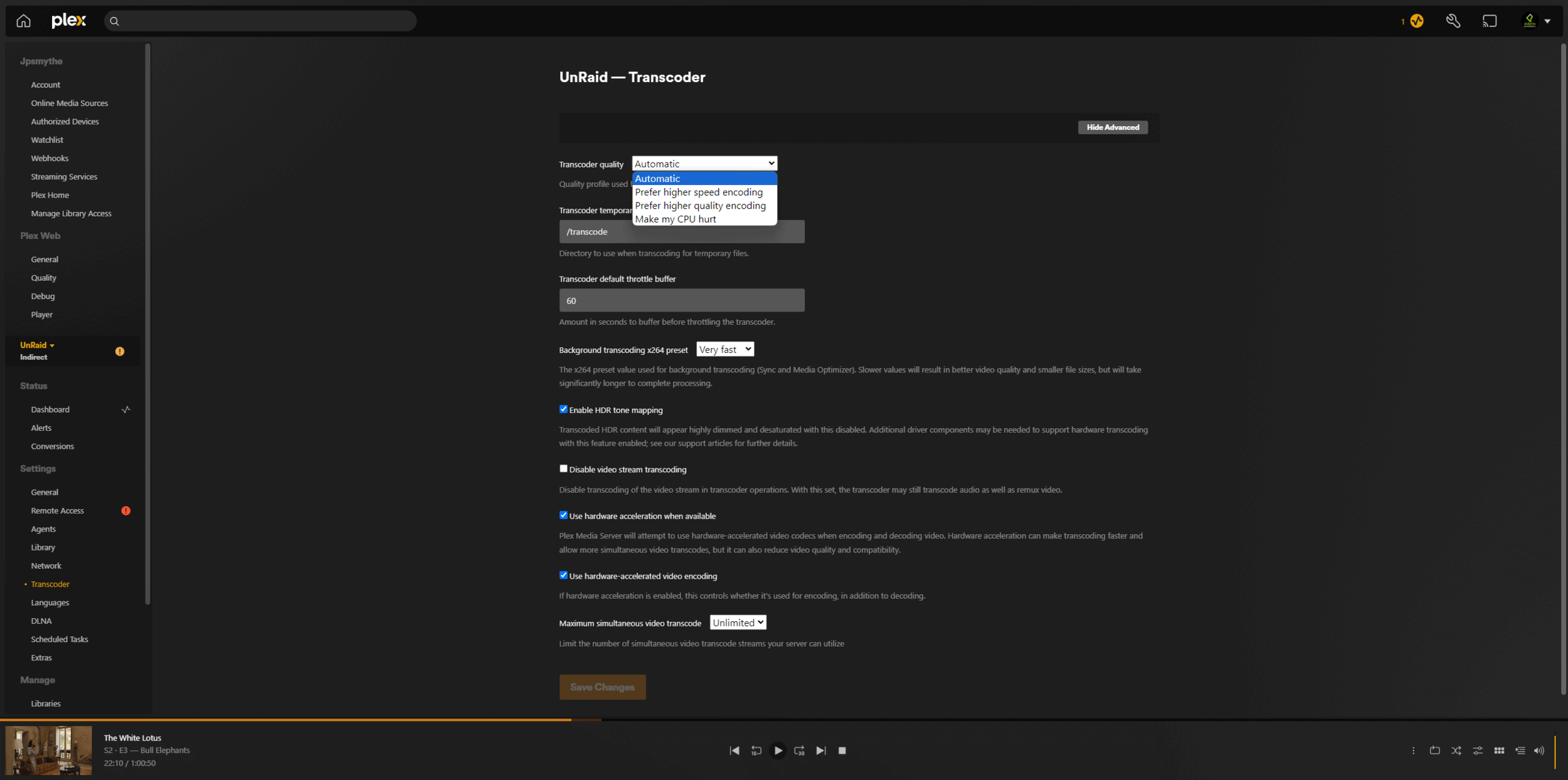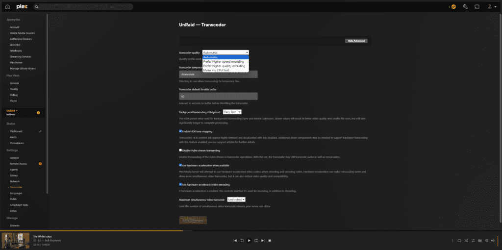 - Transcoding Quality: In Plex server settings, you can adjust the transcoding quality. Setting this to “Make my CPU hurt” will ensure the best quality but will be more CPU-intensive. Adjust according to your server’s capabilities.