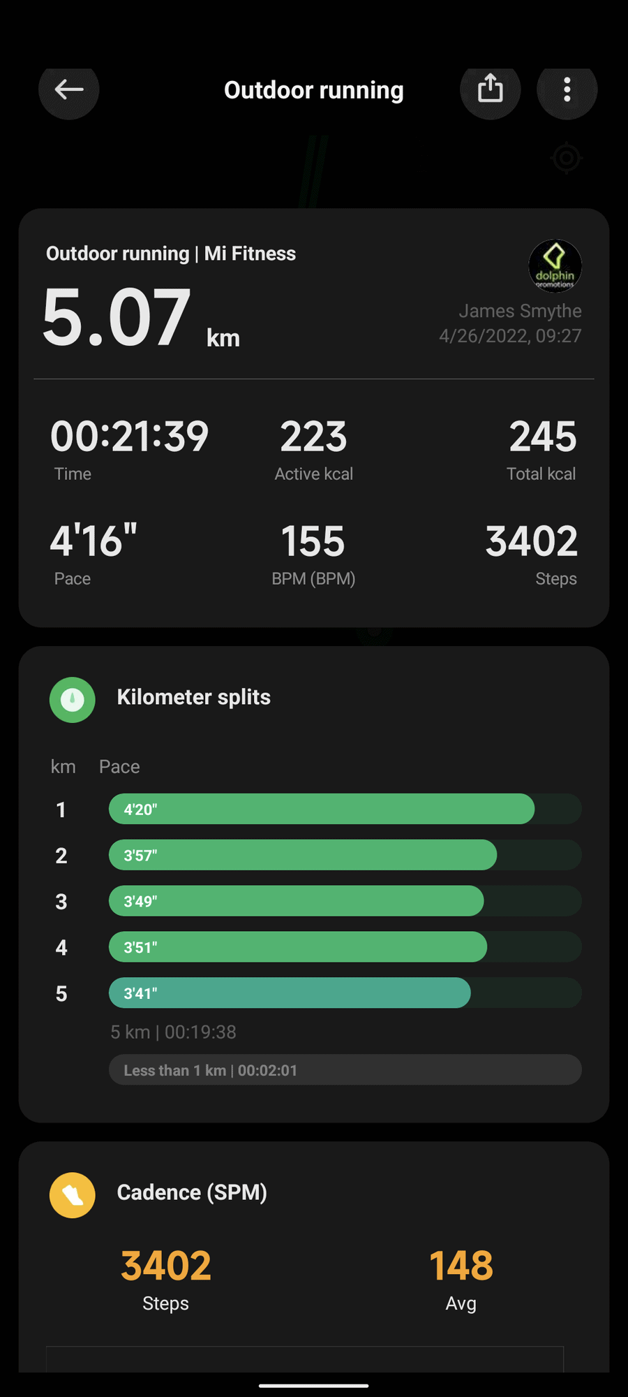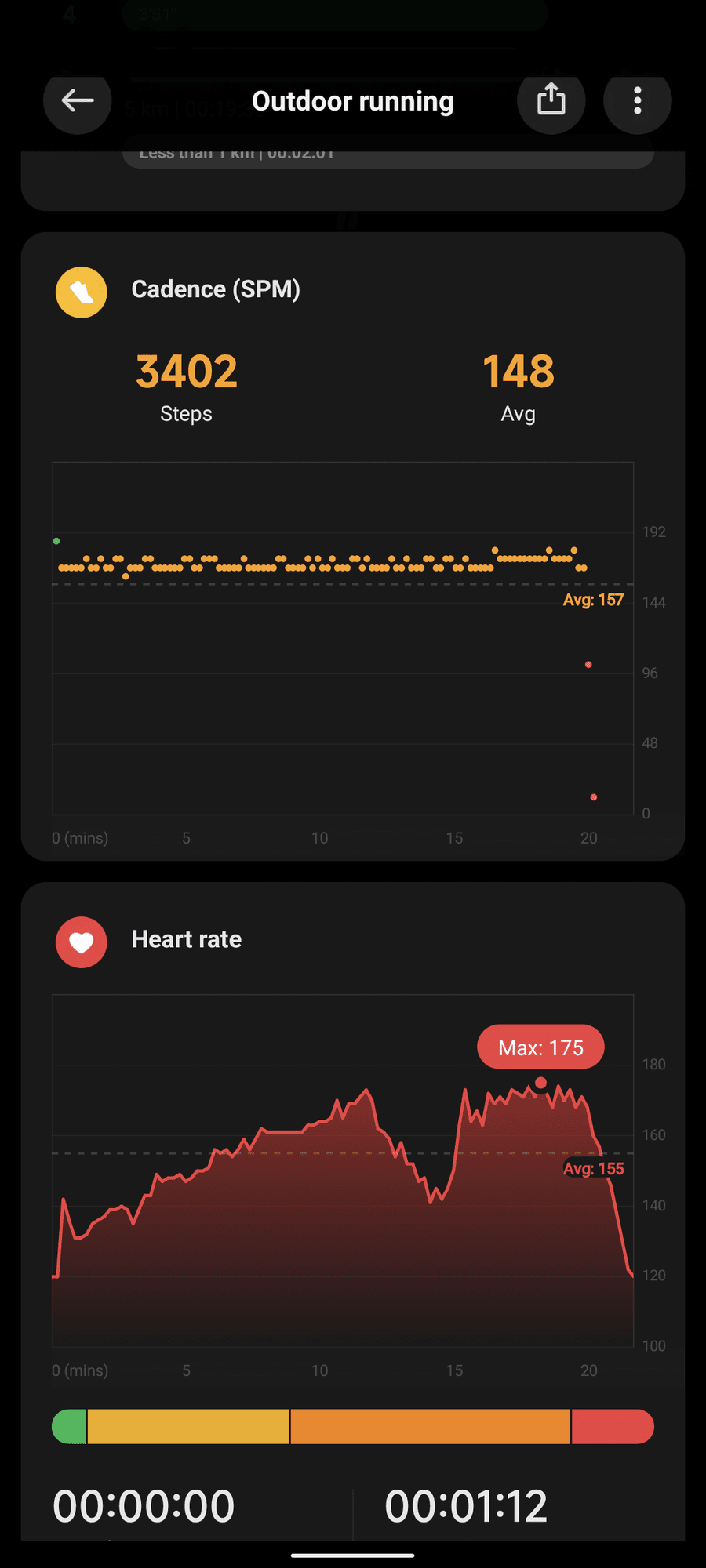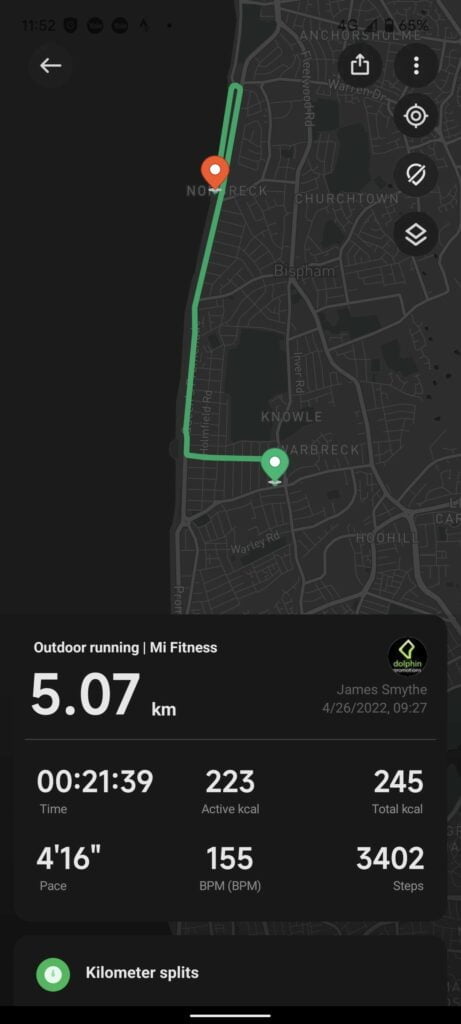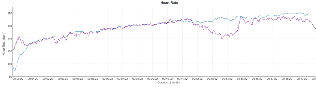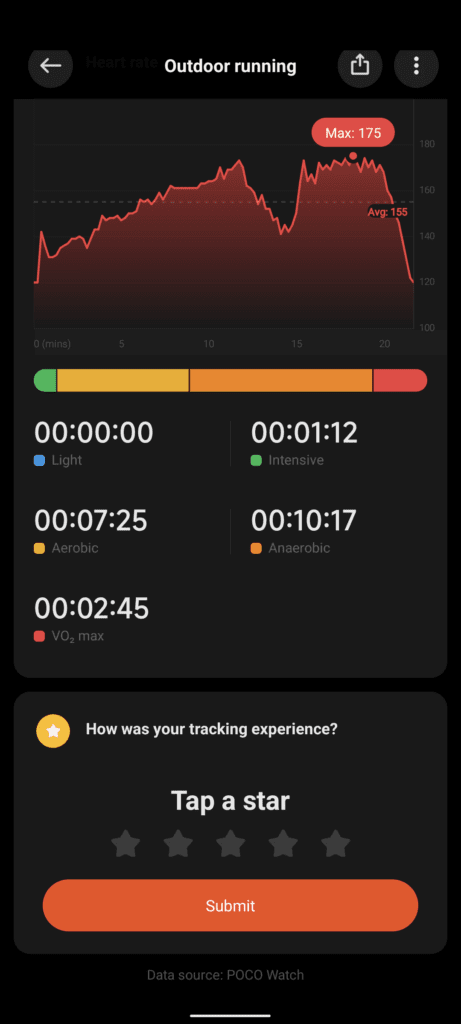 For the Poco, heart rate accuracy was not good. The watch was placed quite high on my wrist and tight, but there were significant inaccuracies. This is very common for me across many devices when using wrist-based heart rate. I am just too hairy and bony. It looks like it struggled to get a proper lock at the start of the run, then from 11m 30s, it lost accuracy completely. The end result was an average HR of 155bpm vs 160bpm on the Garmin.