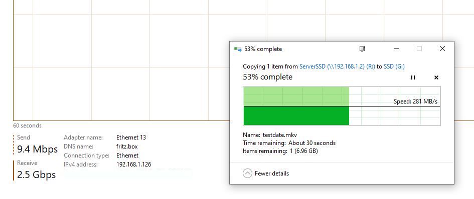 Similarly transferring large MKV files, both Windows Explorer and Task Manager reported the connection remaining consistently at 2.5gbps for reads and a lower 1.5gbps for write