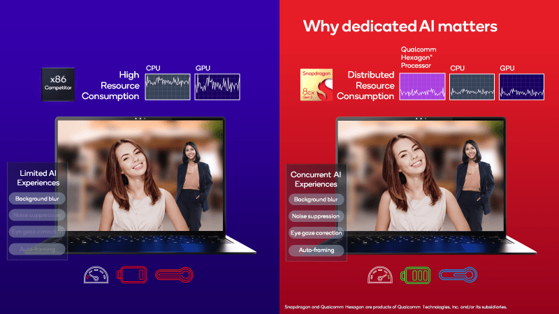 Qualcomm Technologies and Microsoft are advancing AI capabilities and transforming modern laptops with the powerful performance, neural processing, and industry-leading efficiency of Snapdragon compute platforms. This collaboration on Snapdragon has enabled new AI-accelerated experiences for Windows 11 users, including through Windows Studio Effects Voice Focus, and Background Blur. Automatic Framing and Eye Contact which were highlighted at the launch of the Surface Pro 9 5G, featuring the Microsoft SQ3 powered by Snapdragon. Snapdragon intelligently offloads these computationally intensive tasks to a dedicated AI Engine, freeing the CPU and GPU to deliver incredible performance and power efficiency.