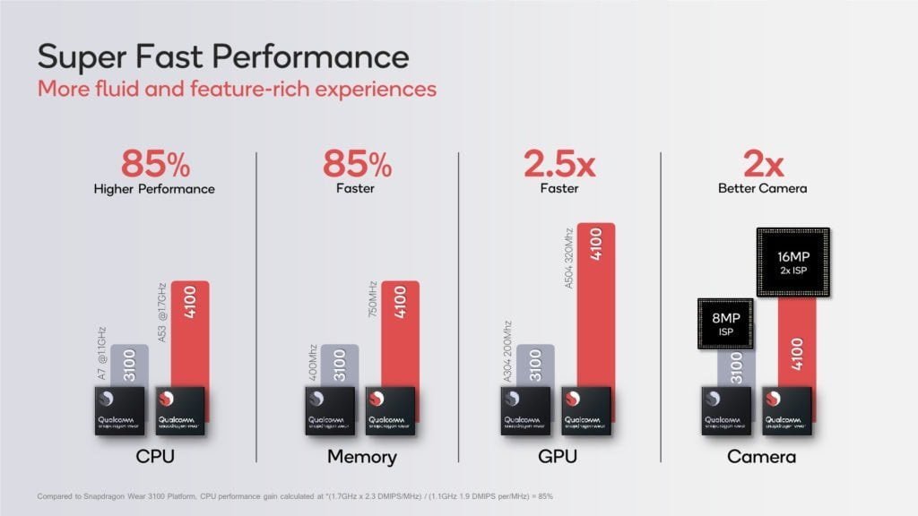 Qualcomm claims an improved CPU performance of 85% with GPU performance going up 2.5 times which should mean WearOS devices never have any issues with general performance.