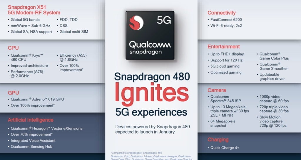 GPU comparisons are harder, Qualcomm uses their own Andreno GPUs and is very vague about the spec. The SD480 has the Adreno 619 which is the same as the Snapdragon 750G and better than the Snapdragon 690 which uses the Adreno 619L. However, we don’t know if there will be frequency differences or something else to reduce performance.