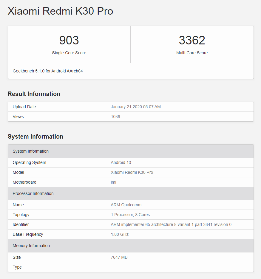 The most recent benchmark is the Xiaomi Redmi K30 Pro. We already have the Xiaomi Redmi K30 which is powered by the mid-range 5G Snapdragon 765G chipset, and the Pro model is likely to launch soon, probably at or around MWC.