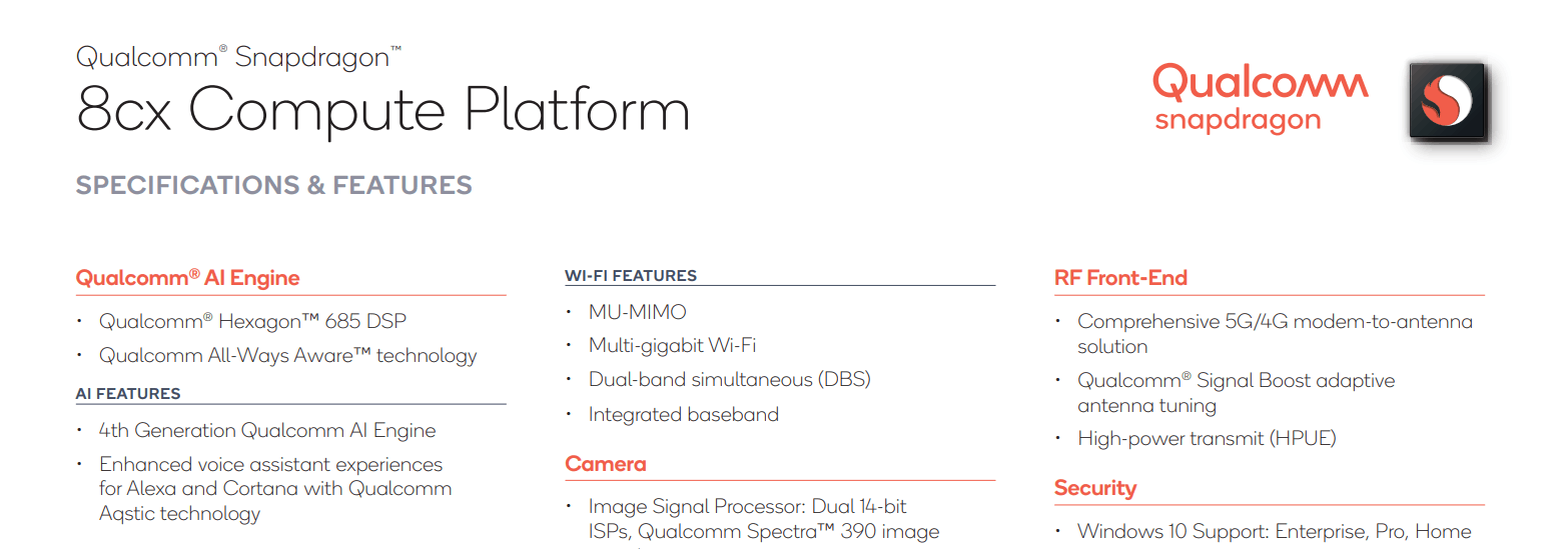 Both the Snapdragon 8cx and 8c feature the Snapdragon X24 LTE modem capable of 2 Gbps down. Both of these can have the optional X55 modem providing 5G.