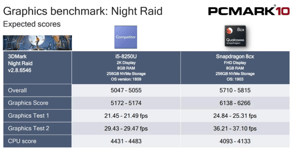 Similar results were found with the PCMark10 Night Raid graphics test with the Snapdragon 8cx edging out frames-per-second – 37.10 FPS versus 29.47 FPS.