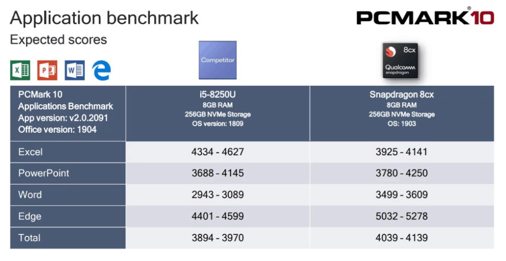 When placed against 8th generation Intel Core i5-8250U with a max turbo frequency of 3.40 GHz the Snapdragon 8cx did quite well, often beating the Core i5 in PowerPoint, Word, and Edge browser usage.