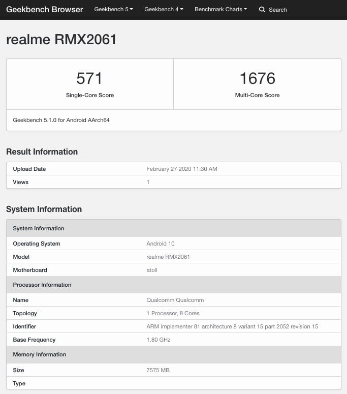 A recent listing for the Realme RMX2061 popped up on Geekbench earlier in the week. This is expected to be the Realme 6 Pro. The phone manages a score of 571 for the single-core and 1676 for multi-core.
