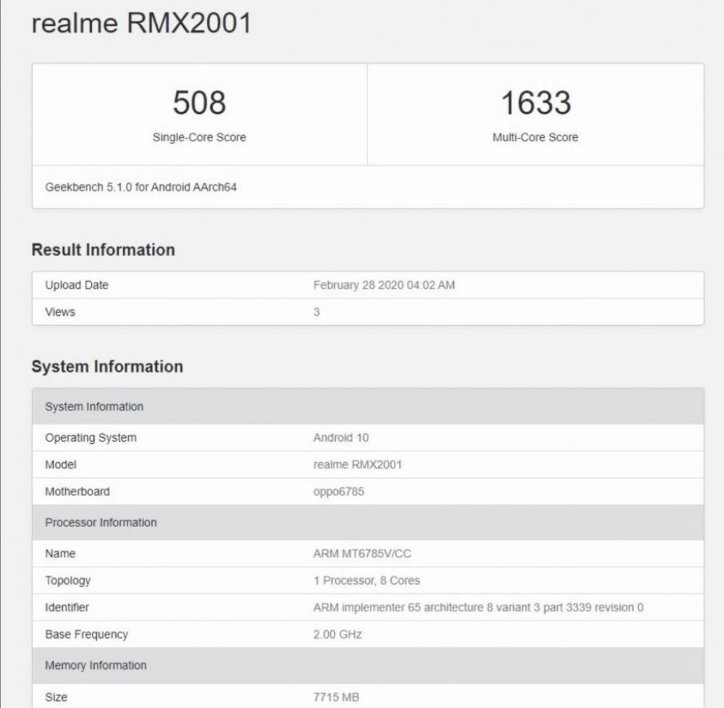 A recent Geekbench listing appears to show the results of the Realme 6 with its codename RMX2001, complimenting the Helio G90 is 8GB RAM.