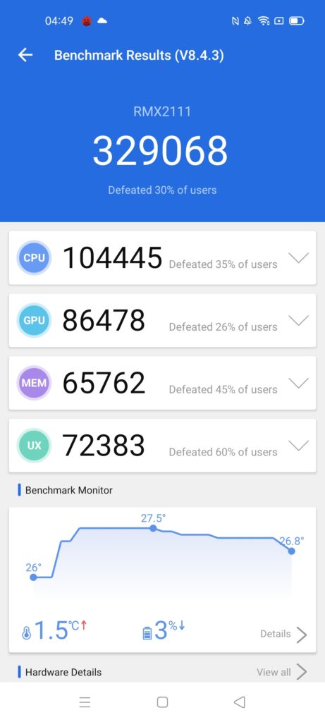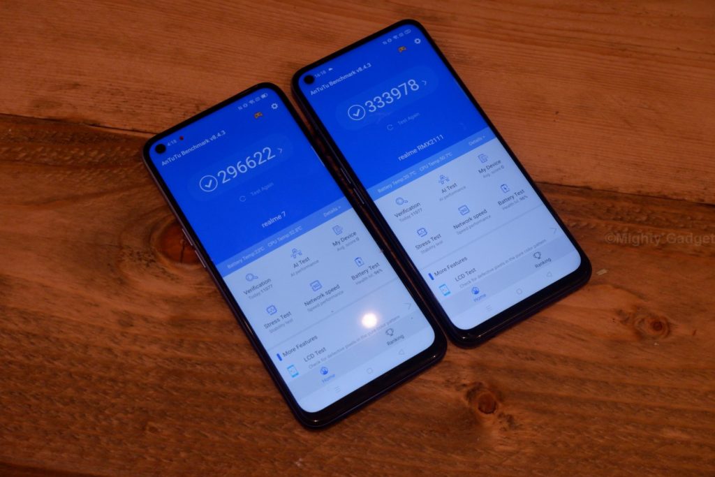 The smart performance mode of Realme phones does something a little odd with benchmarks; in this case, it outperformed the better specced Dimensity 800 and SD765G in Antutu. This is a good example of why relying on benchmarks can be bad.