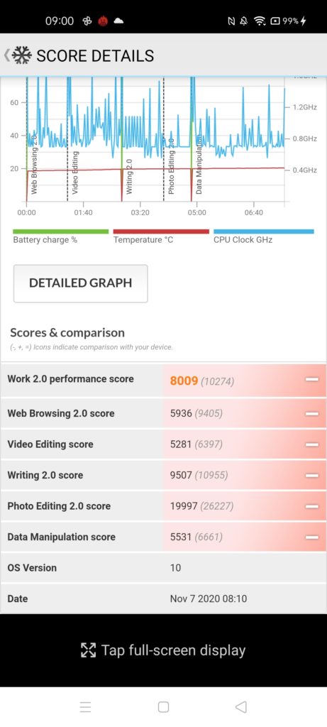 Looking at the numbers, Realme once again scores higher than the better specced OPPO, with an average score of 8009 vs 7863. So it looks like Realme is at the very least a lot more aggressive towards achieving the maximum performance, at the sacrifice of battery.
