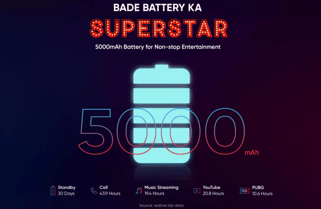 The phone will have a massive 5,000 mAh battery with Realme claiming it will offer 30 days standby, 43.9 hours of calls, 19.4 hours of music streaming, 20.8 hours of YouTube, or 10.6 hours of PUBG Mobile.