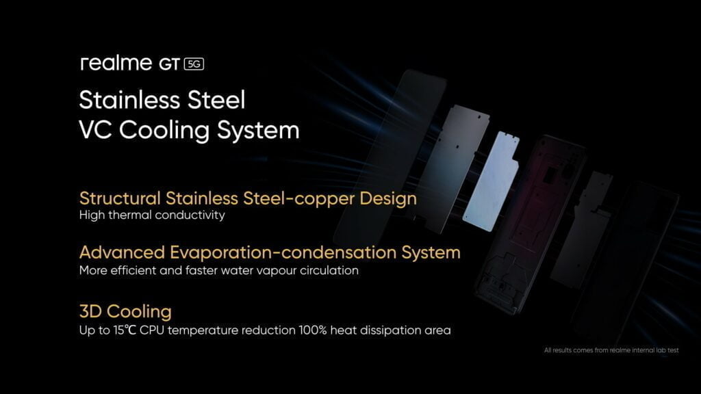 The Realme GT also has a unique design boasting the first Dual-Tone Vegan Leather design that uses two different kinds of material in two different colours, while harnessing the Stainless-Steel VC Cooling System, improving the phone’s heat dissipation performance.