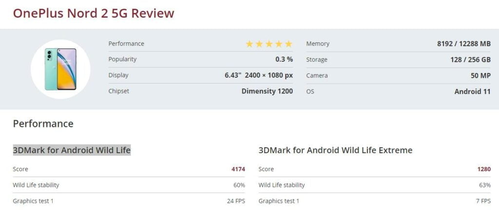 There is one exception here, the 3DMark Wild Life stress test indicates poor 60% stability for the Mediatek Dimensity 1200 on the OnePlus Nord 2. This likely means thermal throttling. The Snapdragon 870 on the ZTE Axon 30 has a 99% stability.