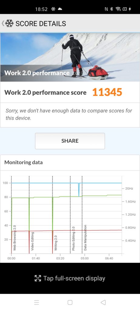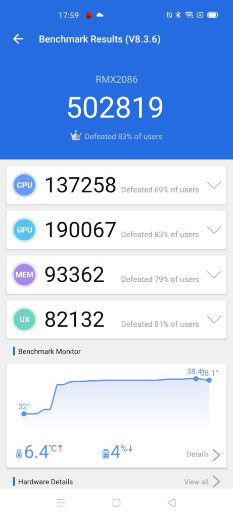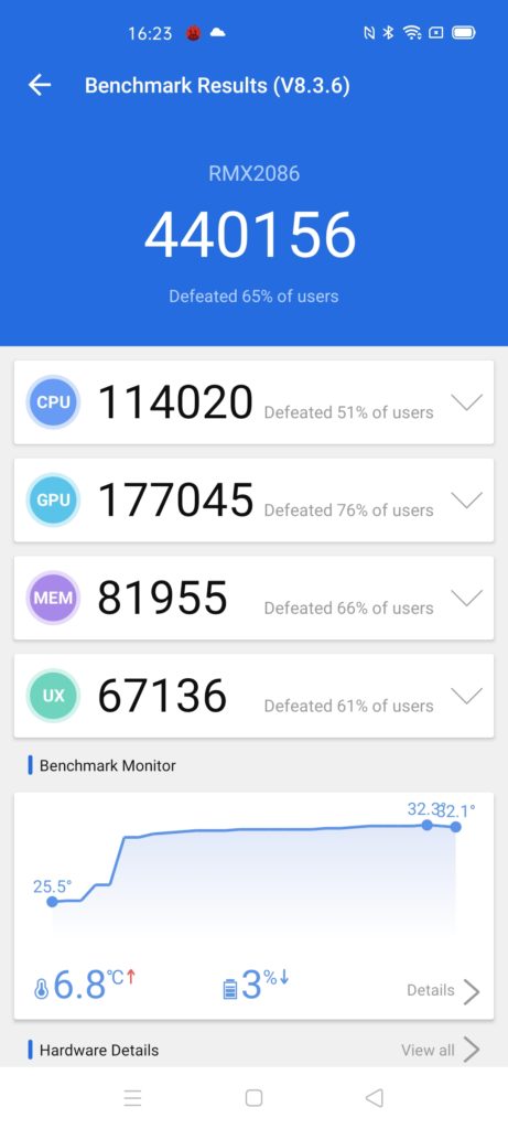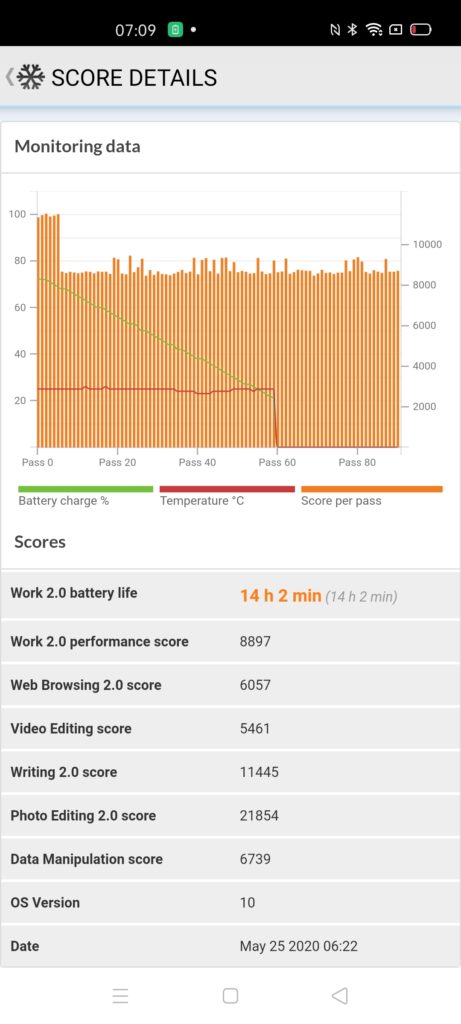 As usual, Realme does some weird things with its smart mode settings, in particular, PC Mark shows it setting the clocks higher than I would expect for day to day use. When running the battery tests, it appears to drop these clocks after a period of time which drops the PC mark score down from over 10K to about 8.5k.
