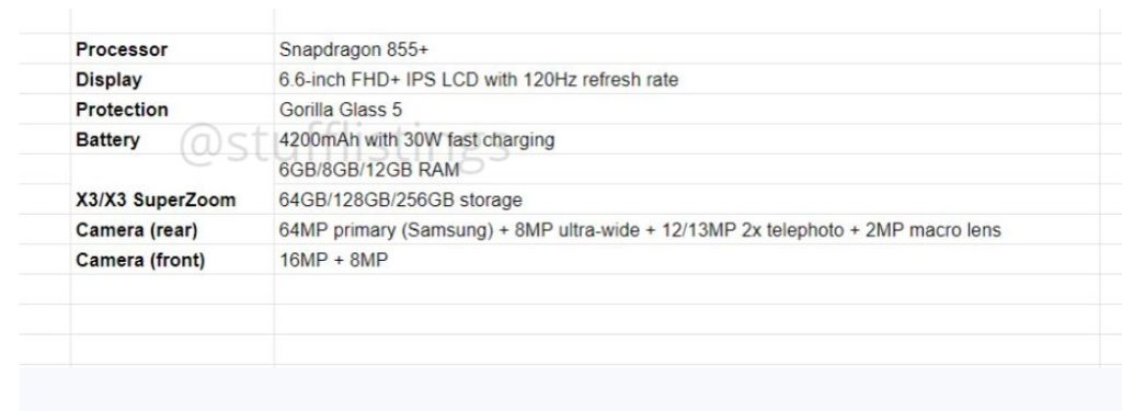 This phone will be almost identical to the SuperZoom using the same Qualcomm Snapdragon 855+ chipset and 120Hz IPS display running at 2400×1080 as well as the same 4200mAh and 30W dart flash charge.