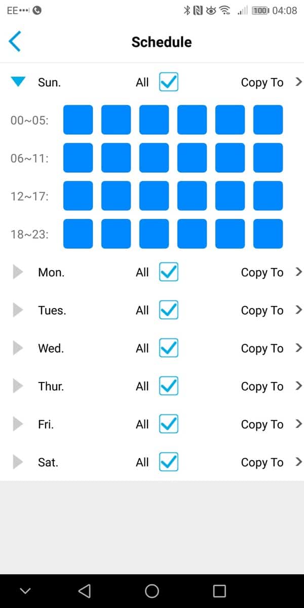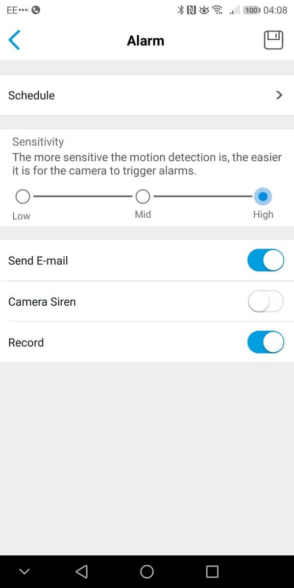 You can manage the PIR settings and have it set up on a schedule if you choose. There are three sensitivity options, and you will need to play with this to get reliable recordings. I tried the high setting, and even a slight shadow would trigger a recording. Within the PIR settings, you can have the camera enable a siren and/or email you.