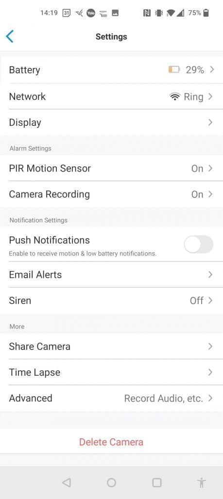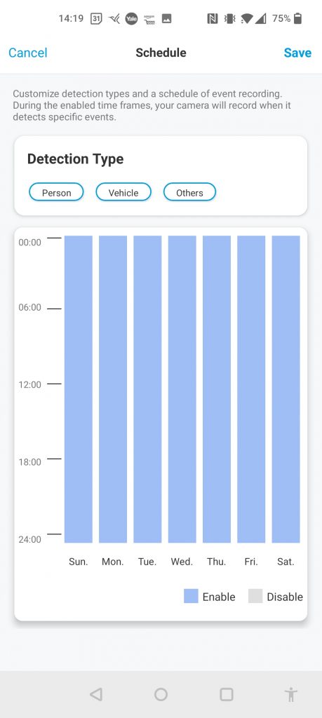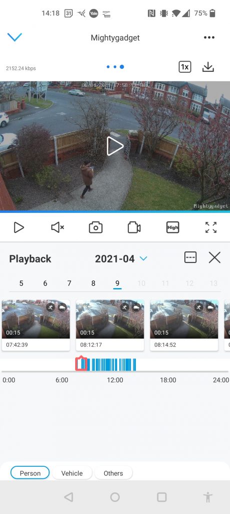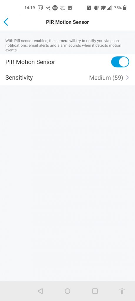 Unlike the other cameras, there appears to be no option for zone motion sensing, so you just set the PIR sensitivity. However, this doesn’t seem to have too much of a negative impact on performance as the smart detection filters out most of the unwanted notifications/recordings for you.
