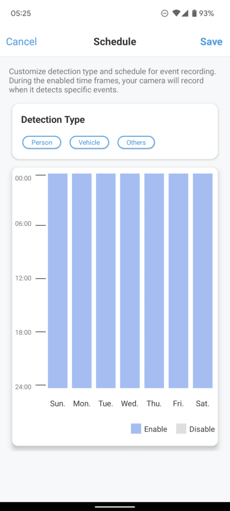 Motion detection works well. There are no motion zones, but the camera supports AI object detection, and within the schedules, you can set which detection type you want to record. It is also possible to increase or decrease the sensitivity allowing you to favour battery or improved surveillance.