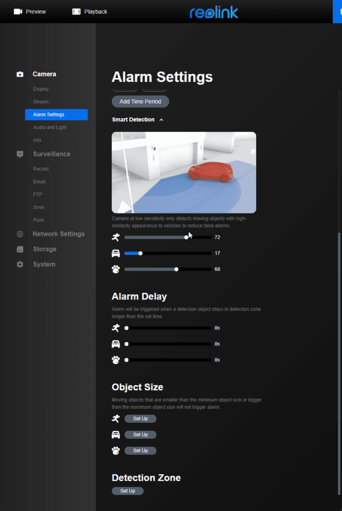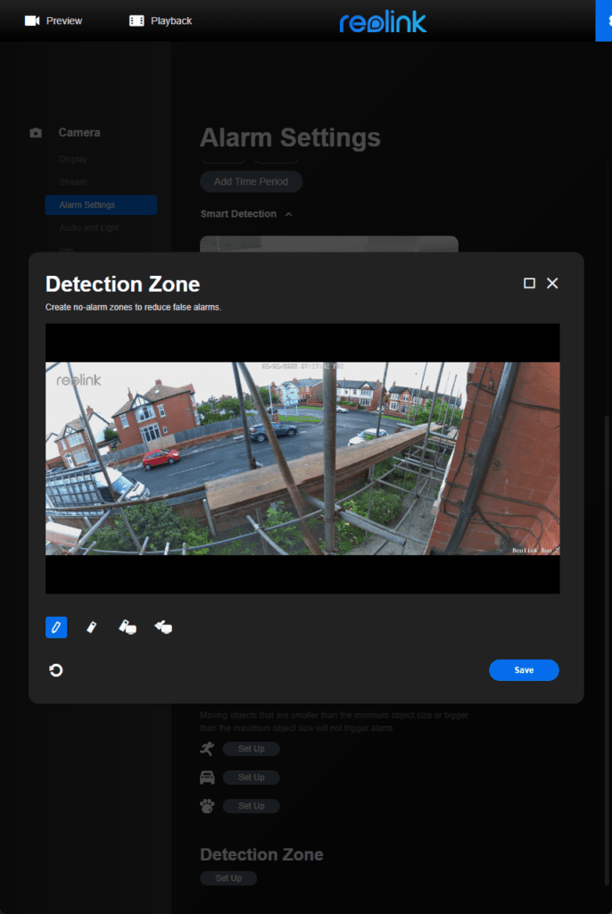 The motion detection is basically the same as all recent Reolink cameras. Due to the very wide field of view, I’d recommend setting up the detection zone. I didn’t, and the camera basically recorded 24/7 to my microSD card because of the cars in the background.