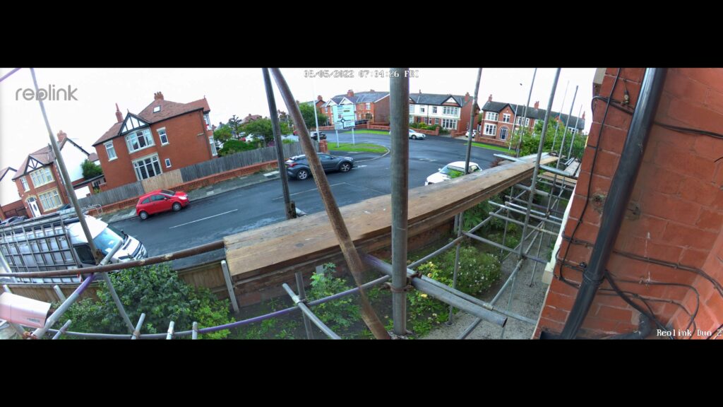For my day time sample footage, I am back to positioning the camera on my windowsill just outside my office. It is not a perfect placement, and at some point, I will set up some sort of easy mounting solution in a set spot for all the cameras I review. With this review, I had scaffolding set up before I had a chance to capture some decent night footage with the spotlight. I, therefore, I had to relocate the camera to my back garden to provide this footage.