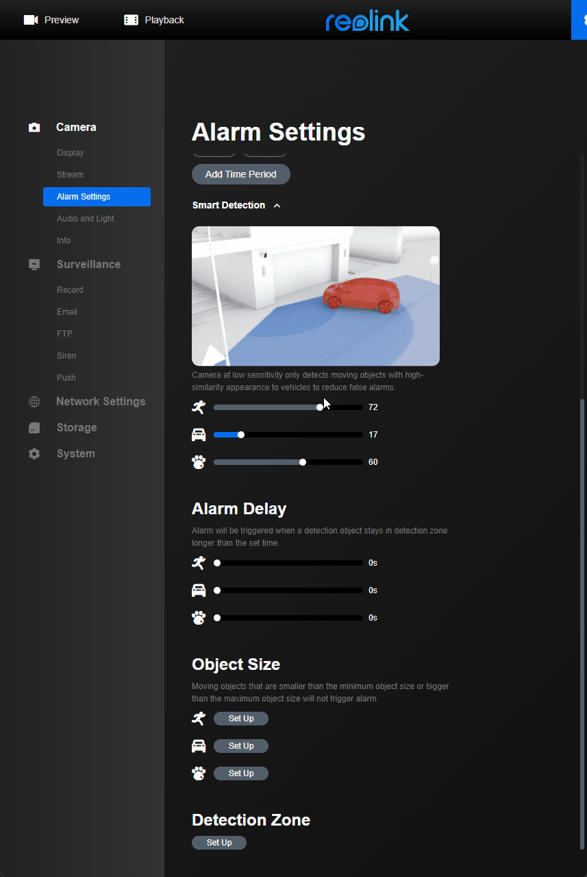 The motion detection is basically the same as all recent Reolink cameras. Due to the very wide field of view, I’d recommend setting up the detection zone. I didn’t, and the camera basically recorded 24/7 to my microSD card because of the cars in the background.