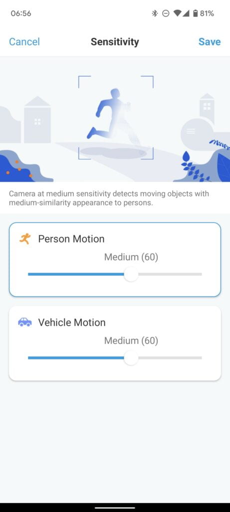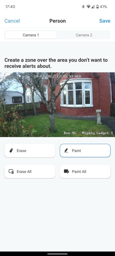 You have zone options for both cameras and can create a specific zone for people, cars and others. You can also adjust the sensitivity for people and car detection.