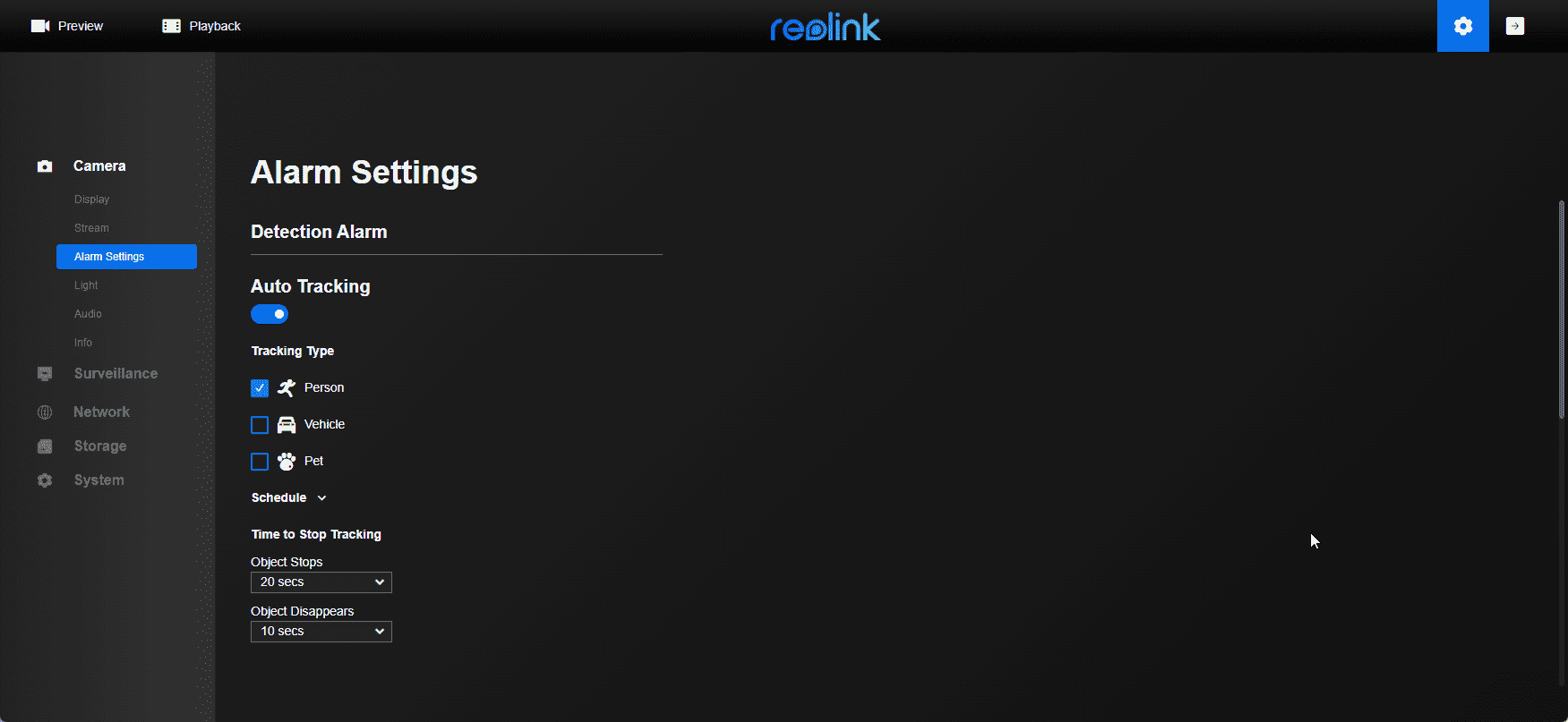 Users can view live footage, control the pan and tilt features, and set up person and vehicle detection.