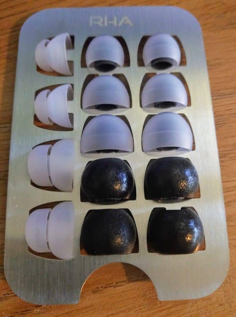 To add to the comfort levels, RHA has included an extensive set of ear tips. There are three pairs normal rubber tips in different sizes, then two double flanged tips and another two foam comply tips. If that was not enough, you also get duplicates of the normal rubber tips in a spare bag. In practice I found it quite difficult to get a good seal with my ear canal with most of the tips. Finally I ended up choosing the large comply tips. Everyone’s ears are shaped differently, and by the number of options, I doubt this will be a huge issue for the majority of people.