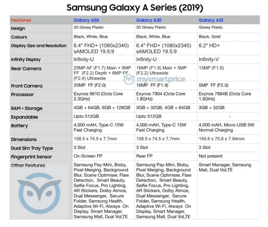 The Galaxy A30 and Galaxy A50 include Samsung Pay Mini, Bixby assistant, Pixel Merging, Background Blur, Scene Optimizer, Flaw Detection, Smart Beauty, Selfie Focus, Pro Lighting, AR Stickers, Dolby Atmos, Dual Messenger, Secure Folder, Samsung Health, Adaptive Wi-Fi, Always-On Display, Smart Manager, Samsung Mall and dual VoLTE. Both phones will be available in