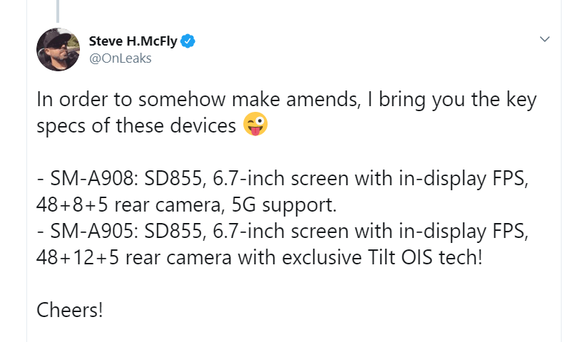 Then the SM-A905 variant will also feature a Snapdragon 855 chipset along with a 6.7-inch screen that houses an in-display fingerprint sensor. The camera setup is a little different here with a 48MP + 12MP + 5MP. This model is also said to feature some exclusive new feature called “Tilt OIS.”