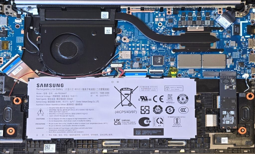 The Galaxy Book4 FE is equipped with a 54Wh battery, which Samsung claims can provide up to 12 hours of usage. In real-world testing, the laptop manages to deliver around 8-9 hours of mixed-use, including web browsing, document editing, and media streaming.