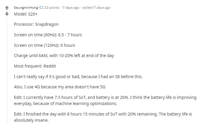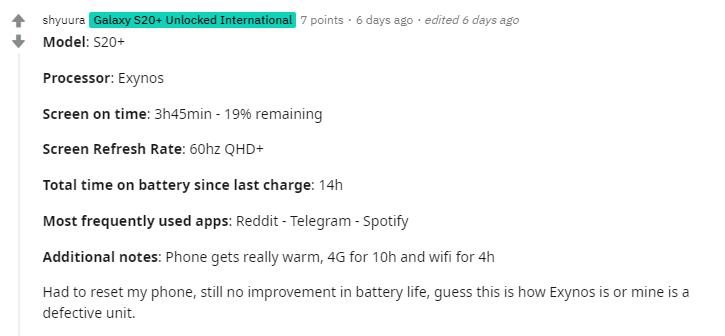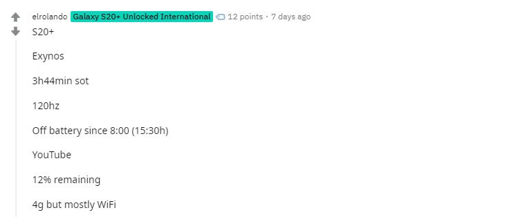 The next comment down has an Exynos user claiming 3H44m screen on-time running at 120Hz – that is basically half the battery performance. Obviously, we don’t know how the two users used their phones, however at least one other person with the S20+ on Exynos running their phone at 60hz QHD+ has 3h45min SOT with and19% remaining, so not ideal.