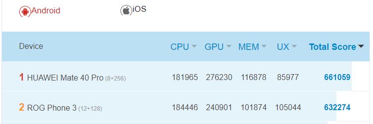 Currently, the Huawei Mate 40 Pro sits at the top of the Android rankings with 661059, while the ROG Phone 3 has 632274. If this leak were accurate, that would mean the Qualcomm Snapdragon 888 (or Exynos 2100) is only 0.346% better in Antutu than the Snapdragon 865+.