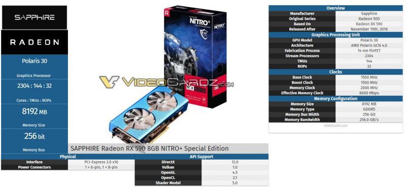 Details of two custom models have been released is the Sapphire Radeon RX 590 Nitro+ and the XFX Radeon RX 590 Fatboy both of which will be factory overclocked to 1600 MHz Core and 8400 MHz VRAM out of the box.