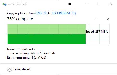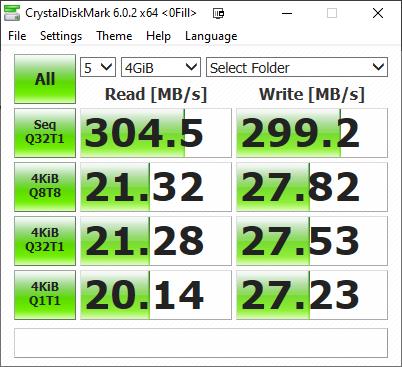 During my testing sequential read and write speeds were a touch lower at 304MB/s and 301MB/s for rear and write using Crystal Disk. Writing to the drive with a large MKV file the speeds were more like 280MB/s