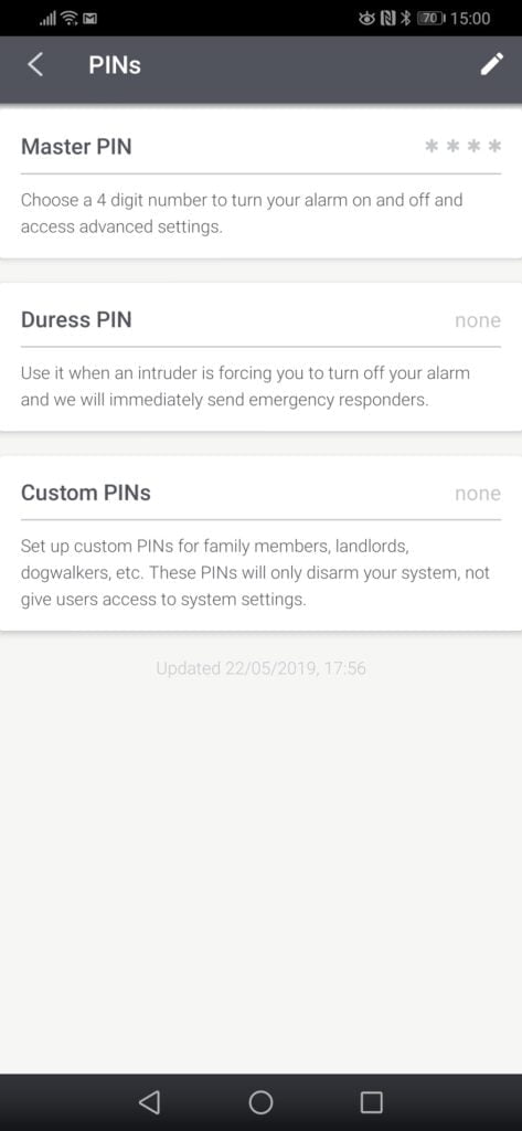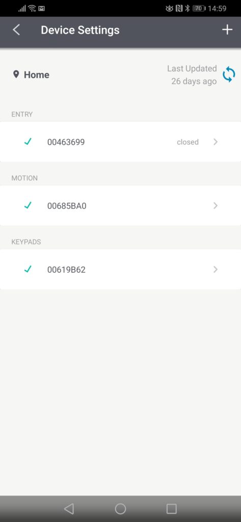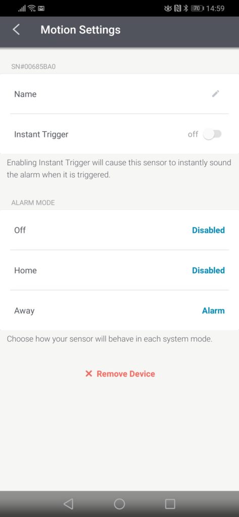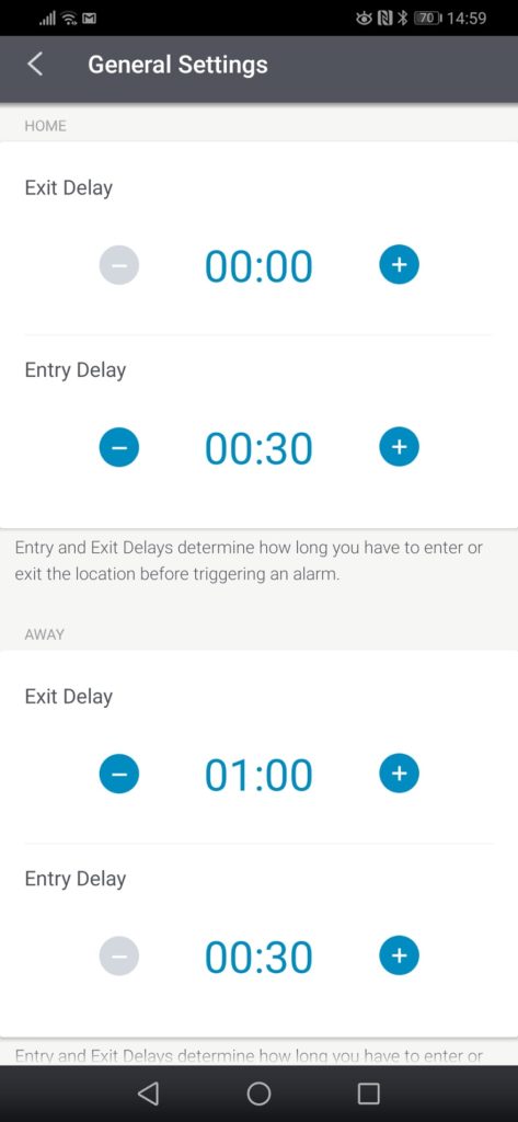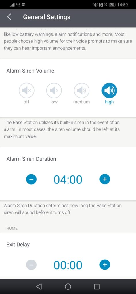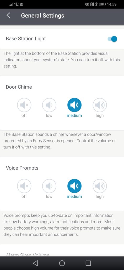 The app replicates the functions of the keypad so you can change settings such as the volume of the voice on the base station, how long the siren sounds for when the alarm is triggered and more. There is an extensive number of settings to tweak things to your liking. You can also see the status of all sensors, plus any warnings.