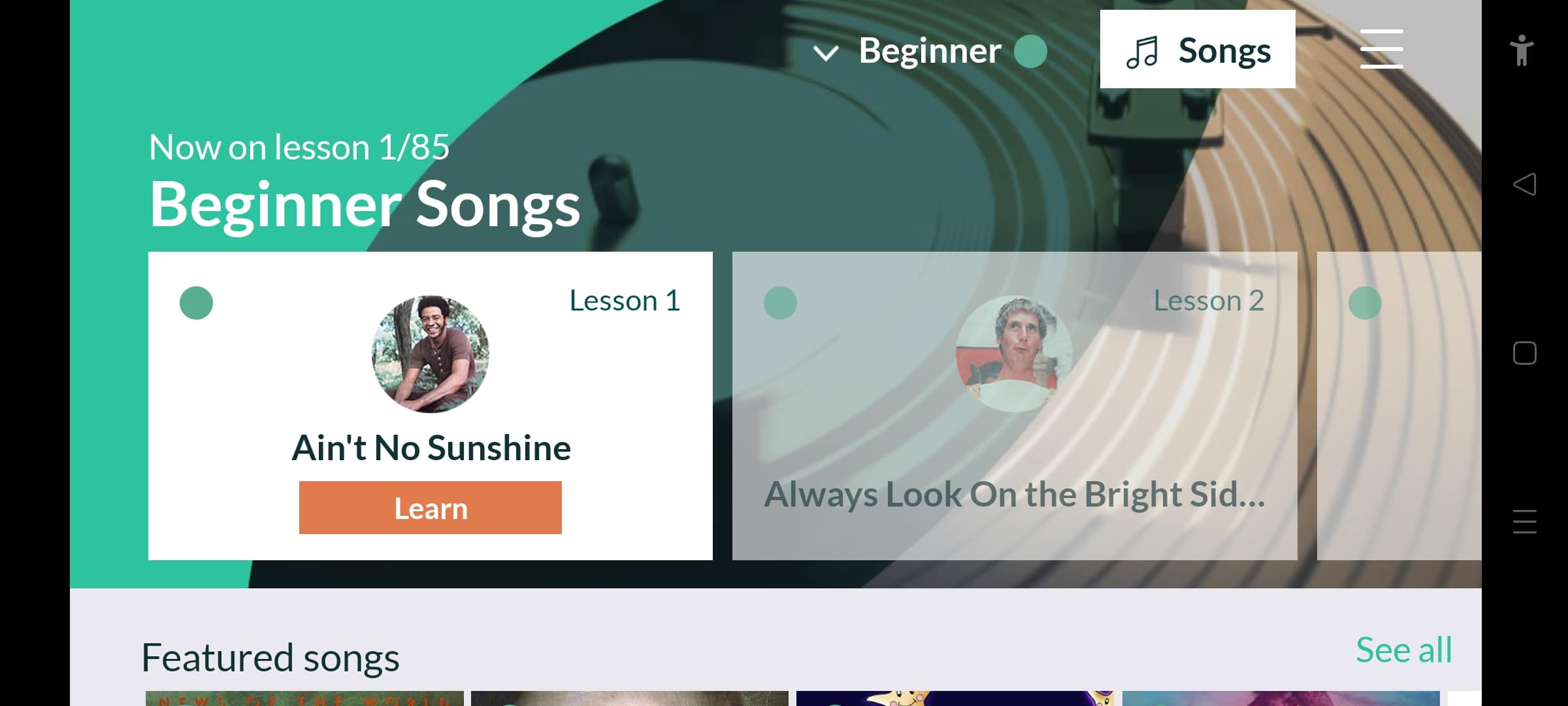 Lean On Me & Finger numbers will start off teaching you with the finger positions with the finger gym practices, as the lessons progress, these will be dropped, and instead, the lessons start out with “get to know the song”.