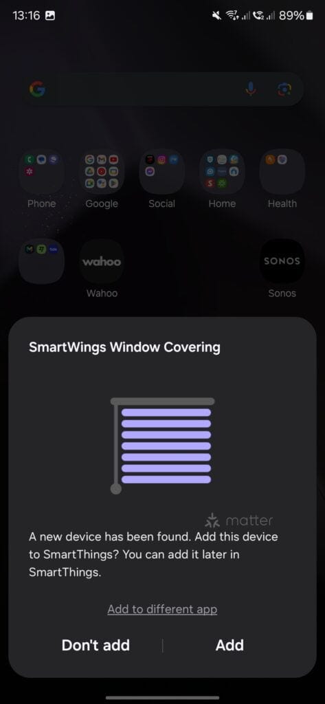 With this, rather than pairing the blinds up using the standard set-up process, I used the share device setting within SmartThings. Doing it this way worked immediately, and it may become my go-to method for all Matter and Matter Over Thread devices in the future.