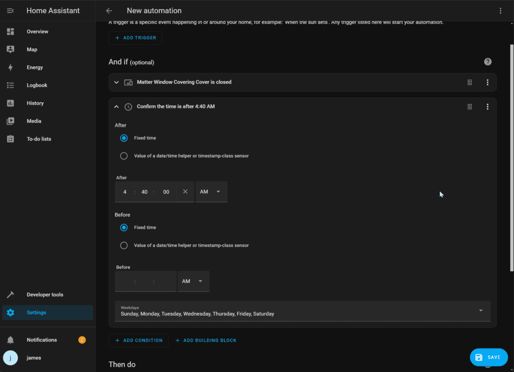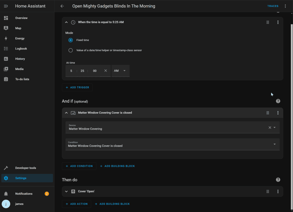 I don’t need anything complex, so I have it set the trigger at 5:25 a.m. and, if the blinds are closed, open them.