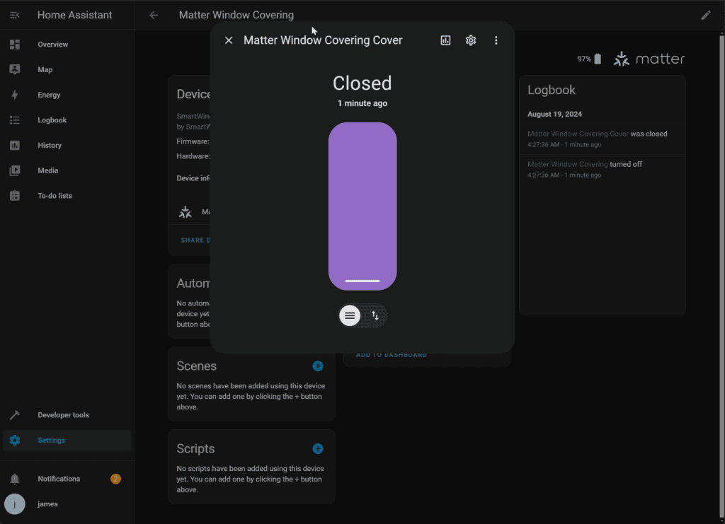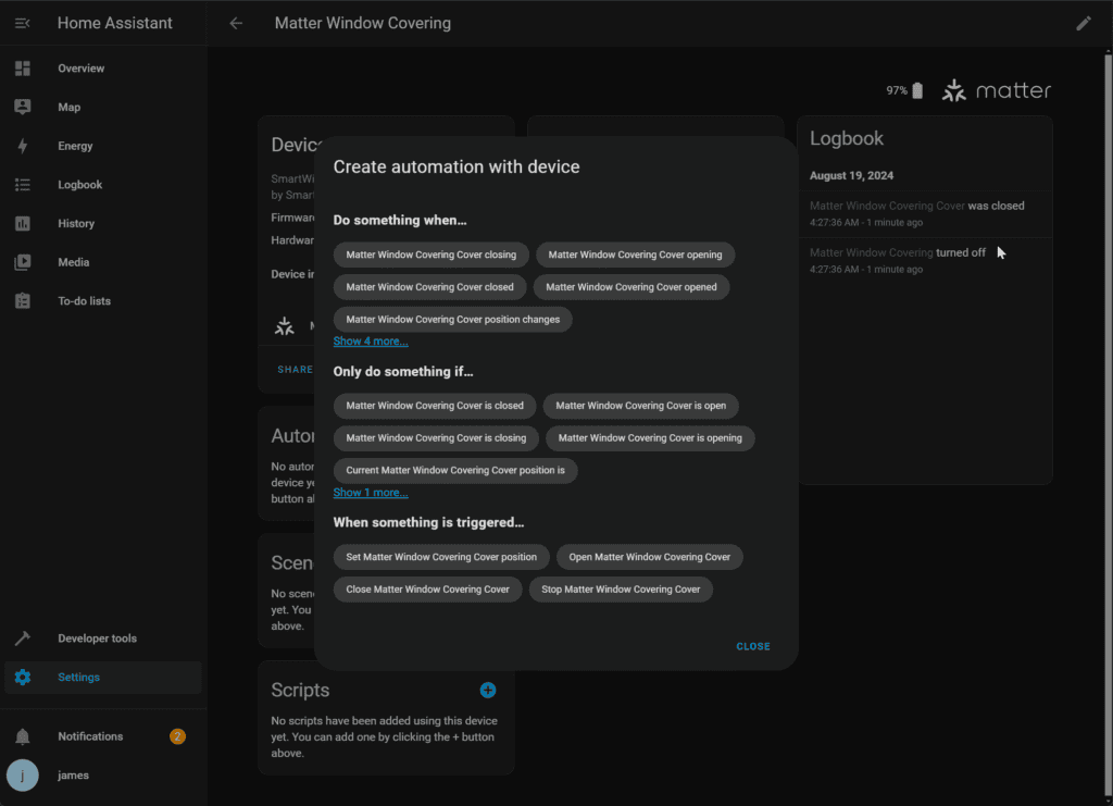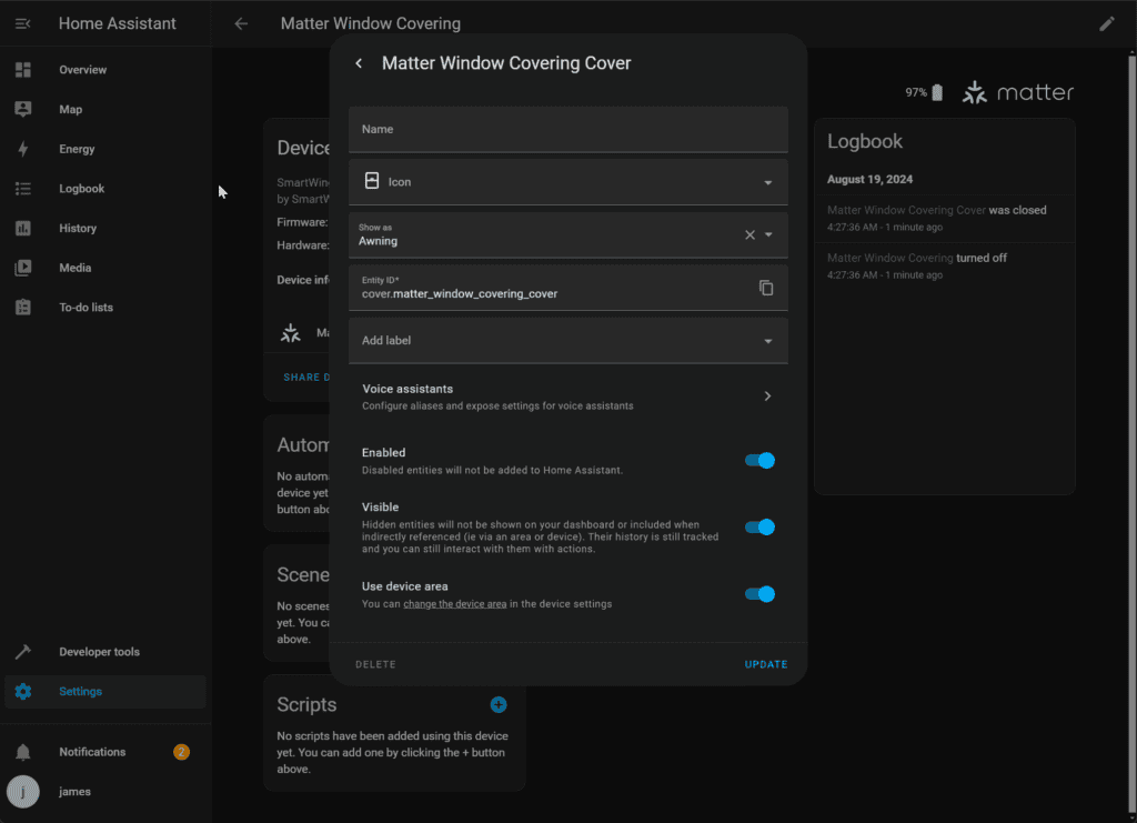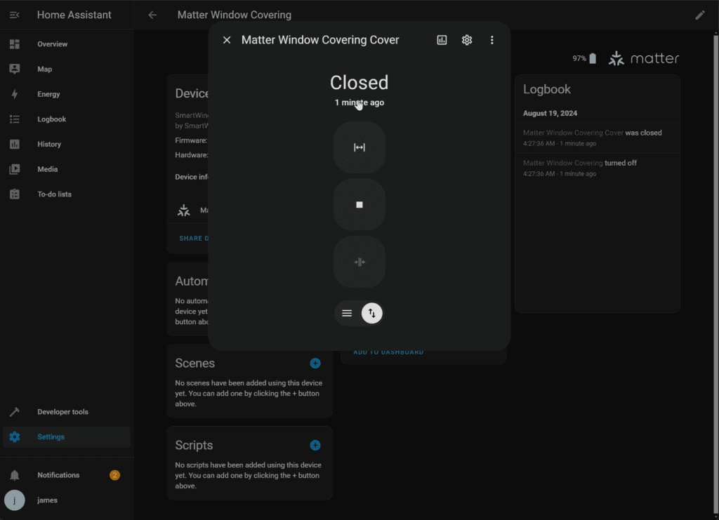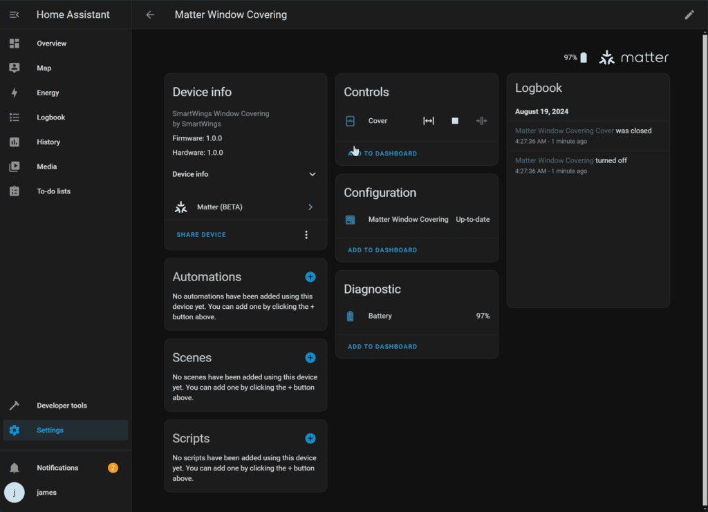 The Home Assistant settings are very similar. Within the device settings you can view if the blinds are up to date, the battery life, controls and a log book of events.