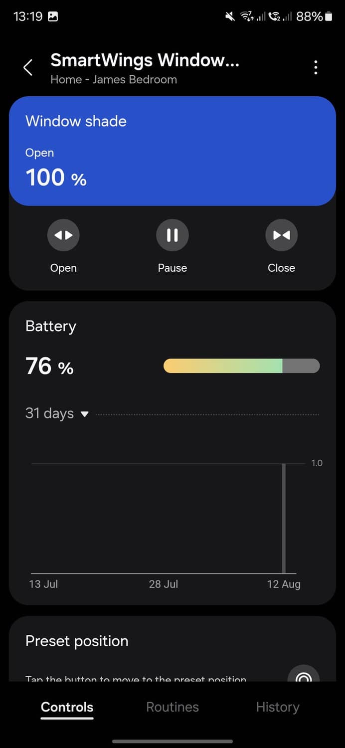 The settings within SmartThings are basic but do everything you could want. On the device page, you can open/close or set the blind position. There is also a log of events that shows the battery life. Under the settings, you can define a preset position, and there is a button on the device page to go to the preset.