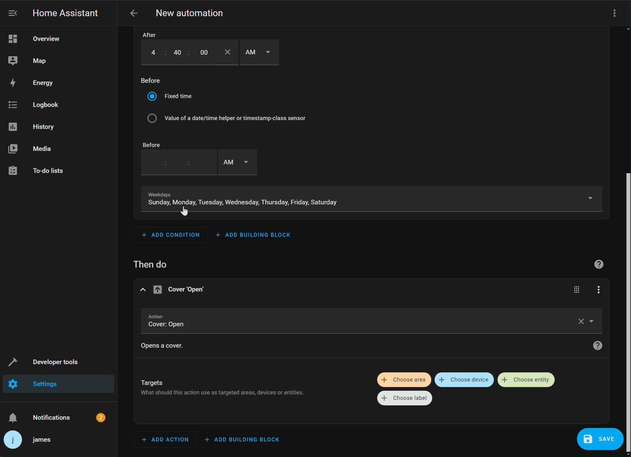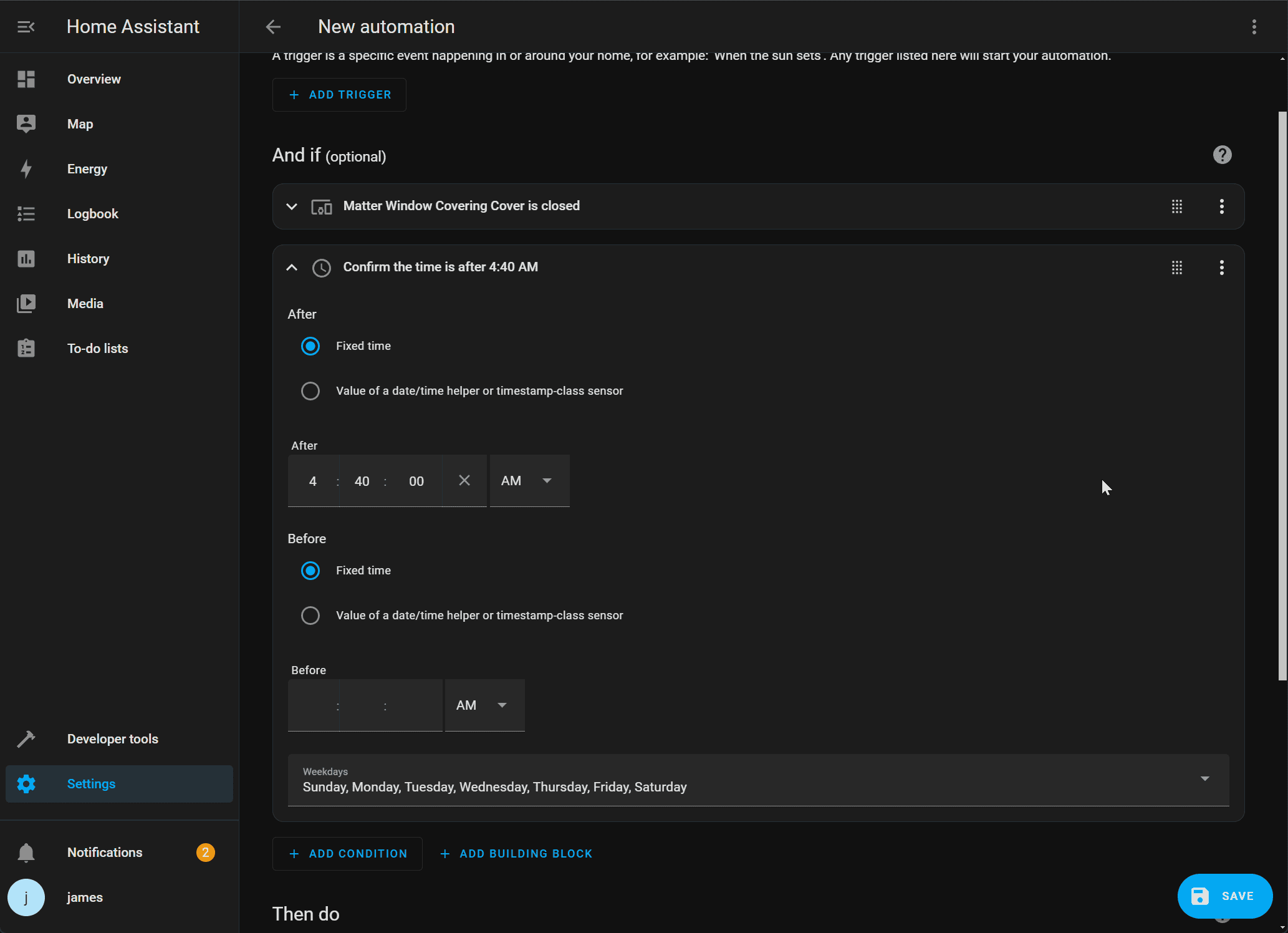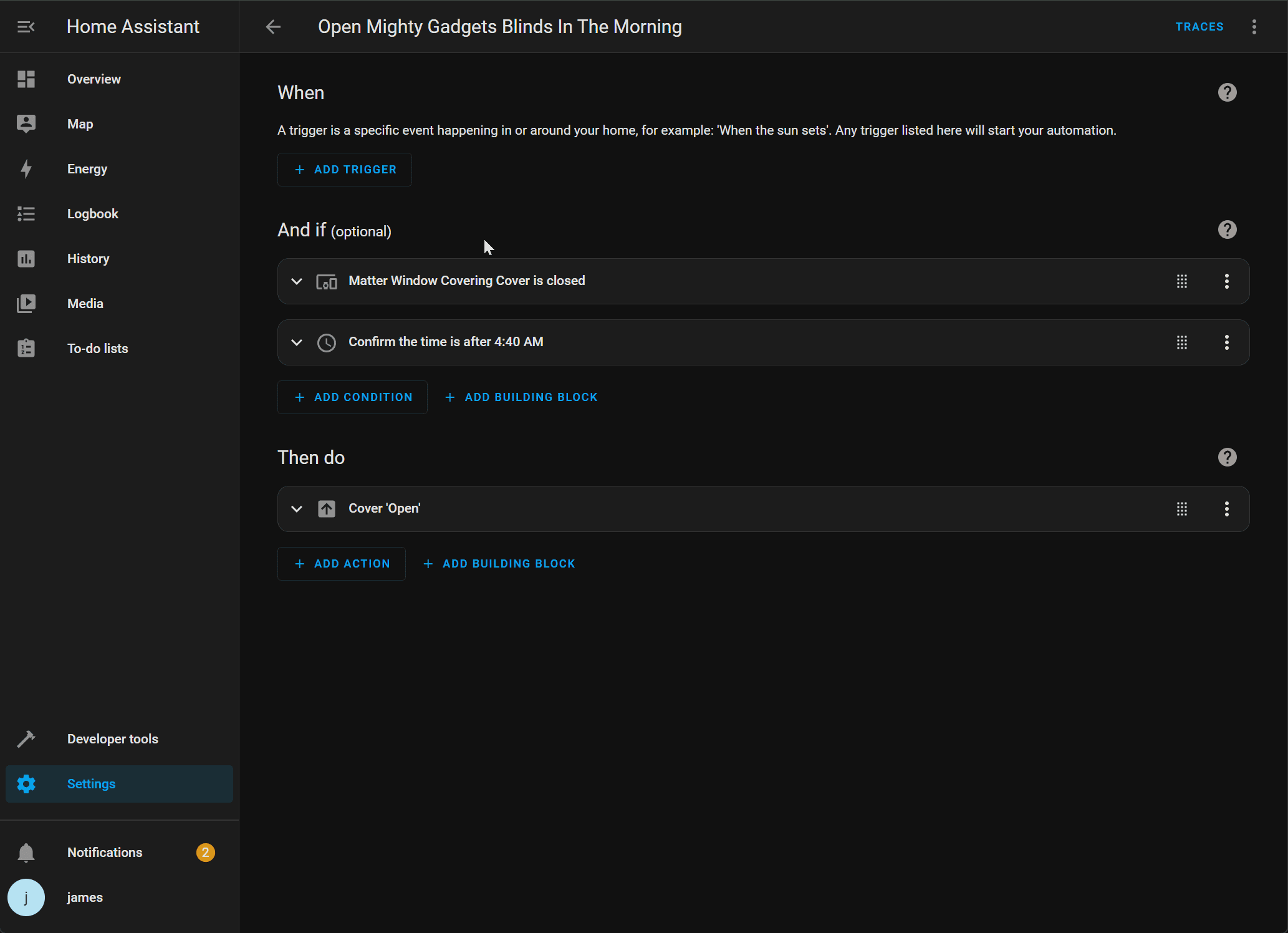 I don’t need anything complex, so I have it set the trigger at 5:25 a.m. and, if the blinds are closed, open them.