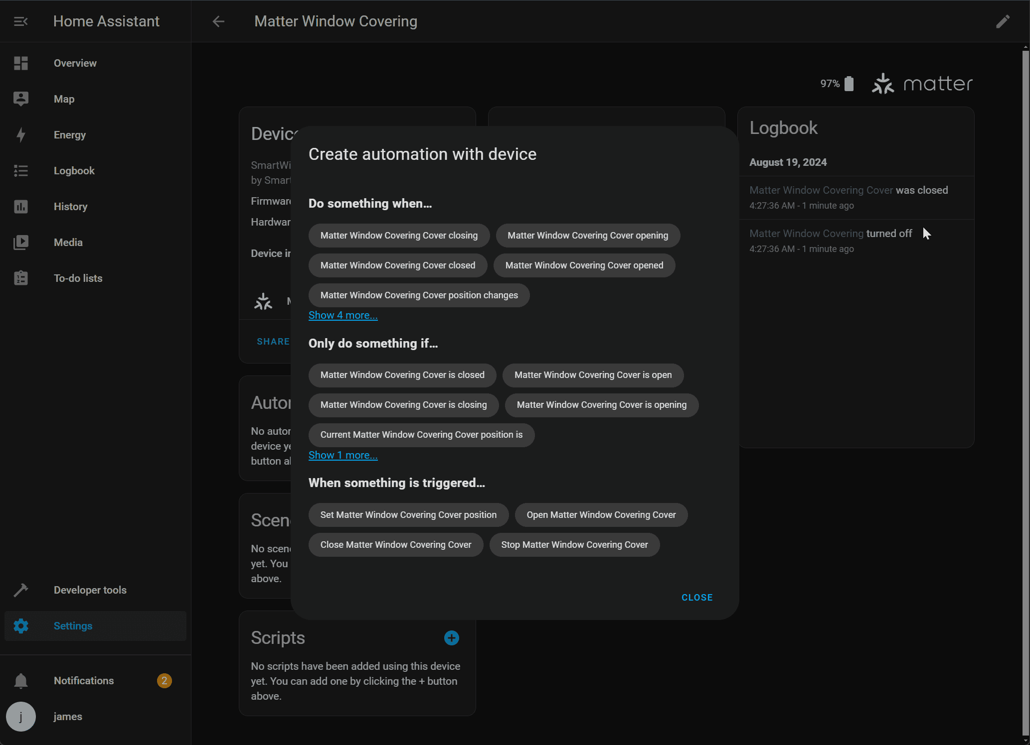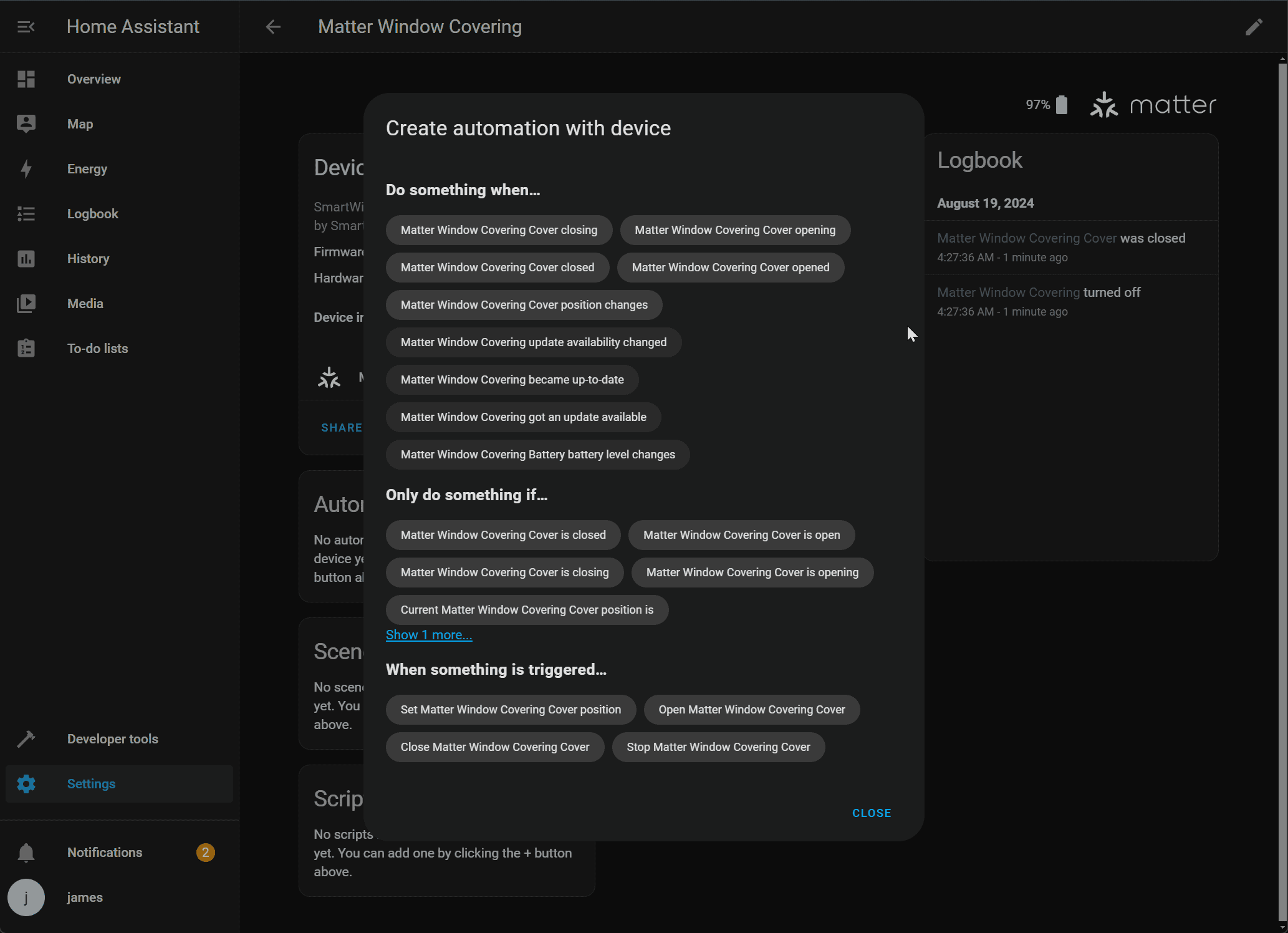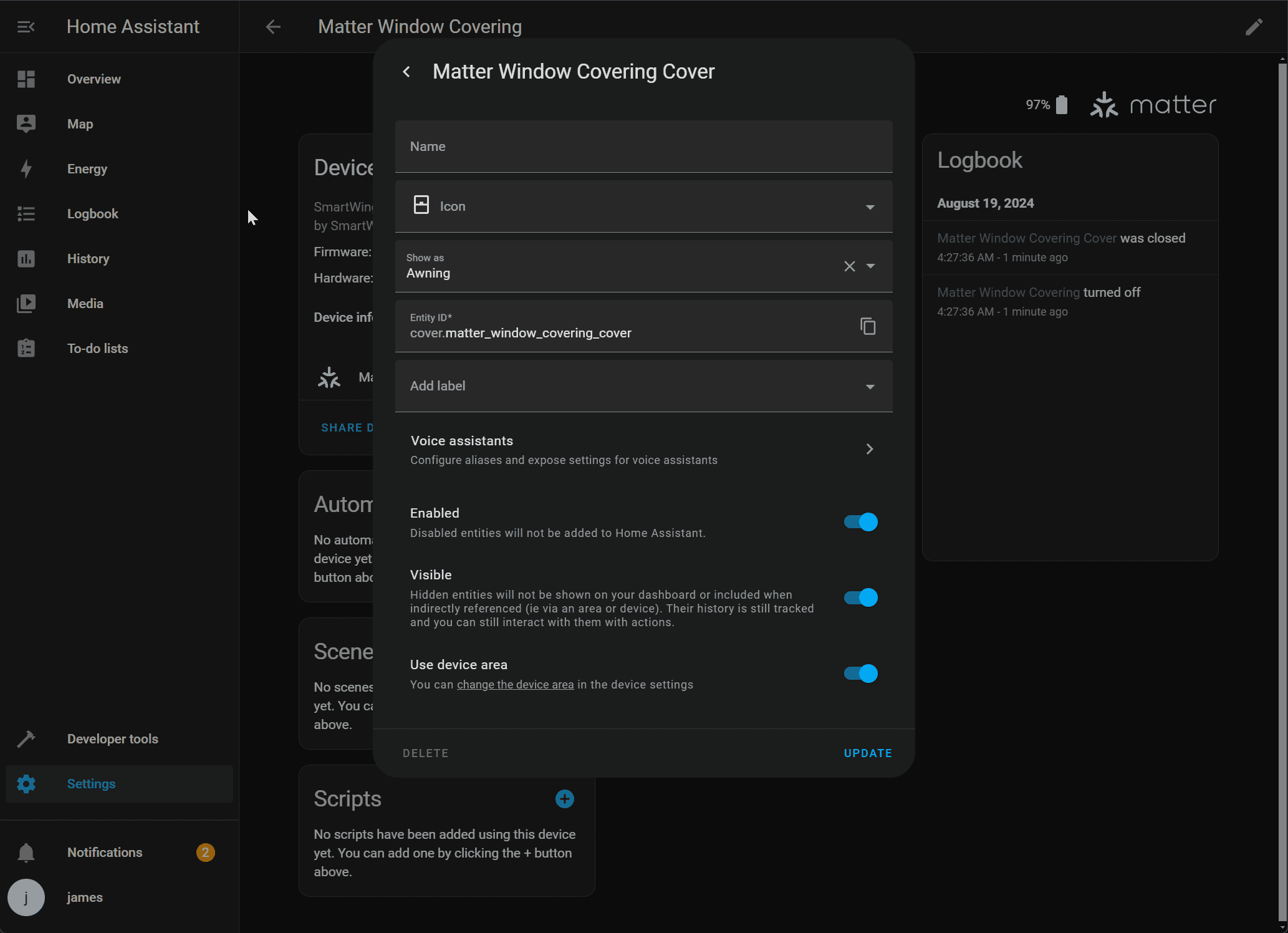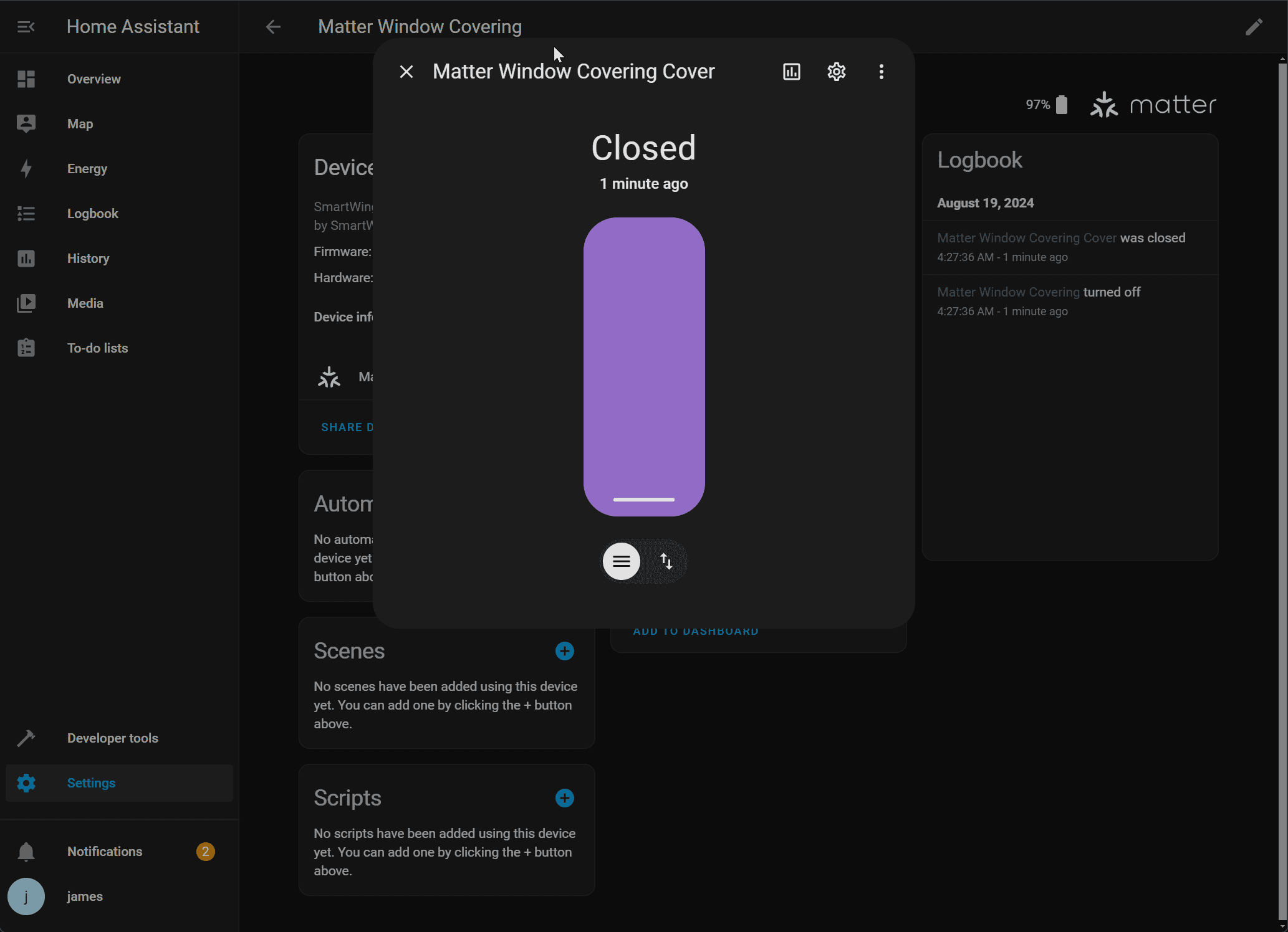 The Home Assistant settings are very similar. Within the device settings you can view if the blinds are up to date, the battery life, controls and a log book of events.
