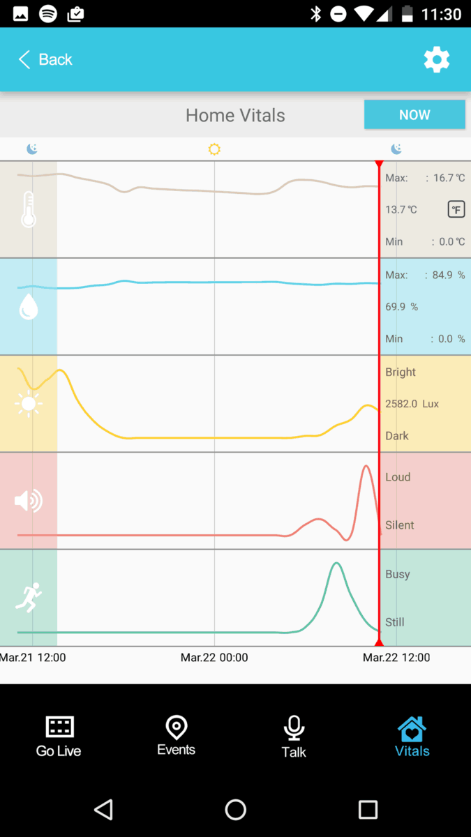 One of the big selling points is the environmental sensor. In the app, you have temperature, humidity, luminance, motion and sound. These all work as expect and you get a nice graph showing historical readings.  Individually these are not much use but you can use the various readings to trigger events either from the App itself or using IFTT.