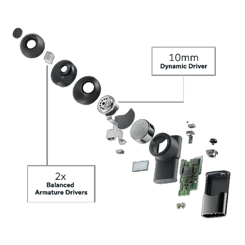 The Between 3ANC earbuds are the flagship option and quite unique for ANC TWS earbuds due to the triple driver design, which consists of two balanced armature drivers + one dynamic driver in each earbud. This allows the earbuds to offer ultra-wide frequency response with stunning clarity.