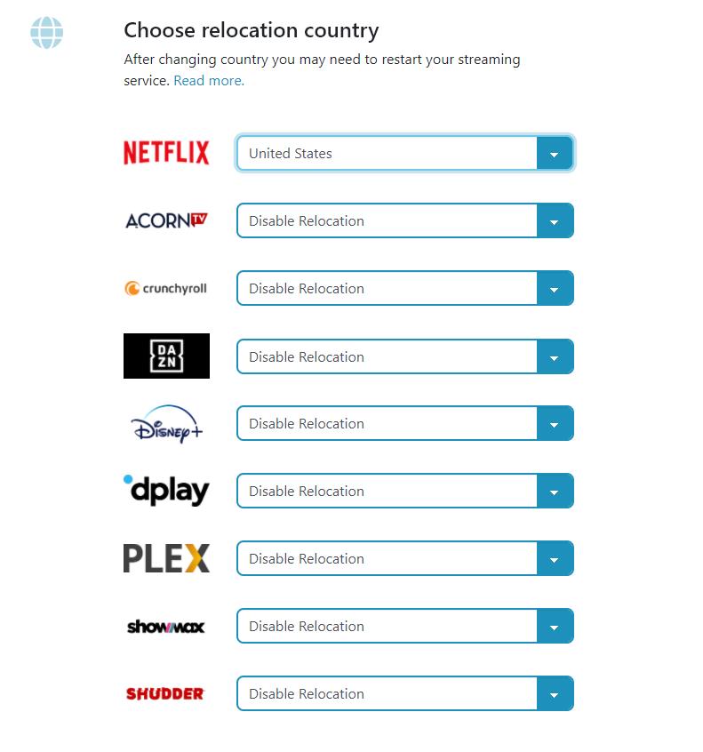 With the account set up, the settings are basic; you can assign a country to various services. For most, it is the US and occasionally the UK. Others have some European options too. This is better than other SmartDNS servers I have tried, most of them have no options and just unblock US content.