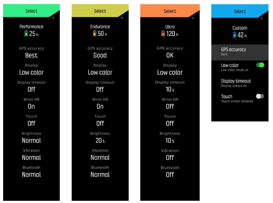 Suunto hasn’t found a way to magically improve the battery performance of GPS. Instead they new watch has some pretty clever settings that reduce battery draining features. The watch has 3 predefined modes that you can quickly set for any exercise you start, and then a custom mode which will allow you to define your own settings.