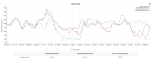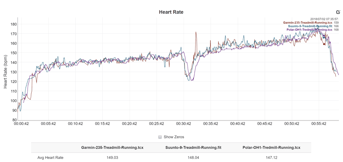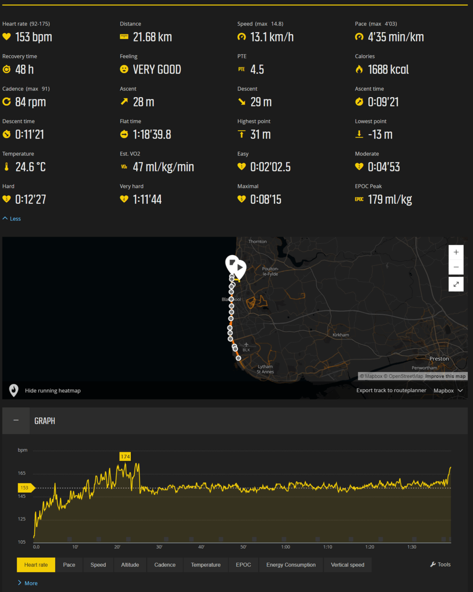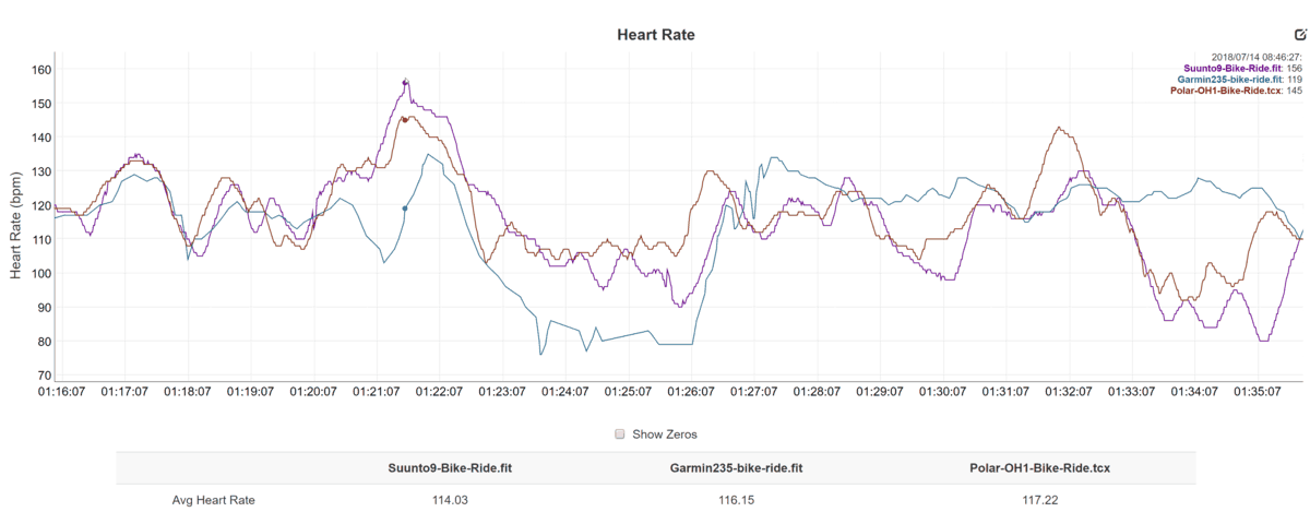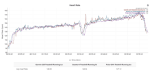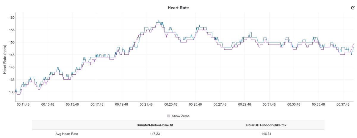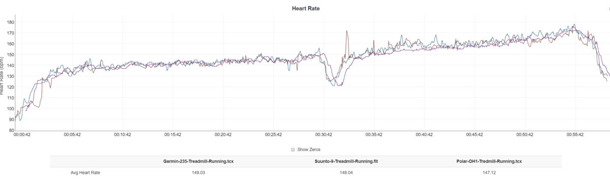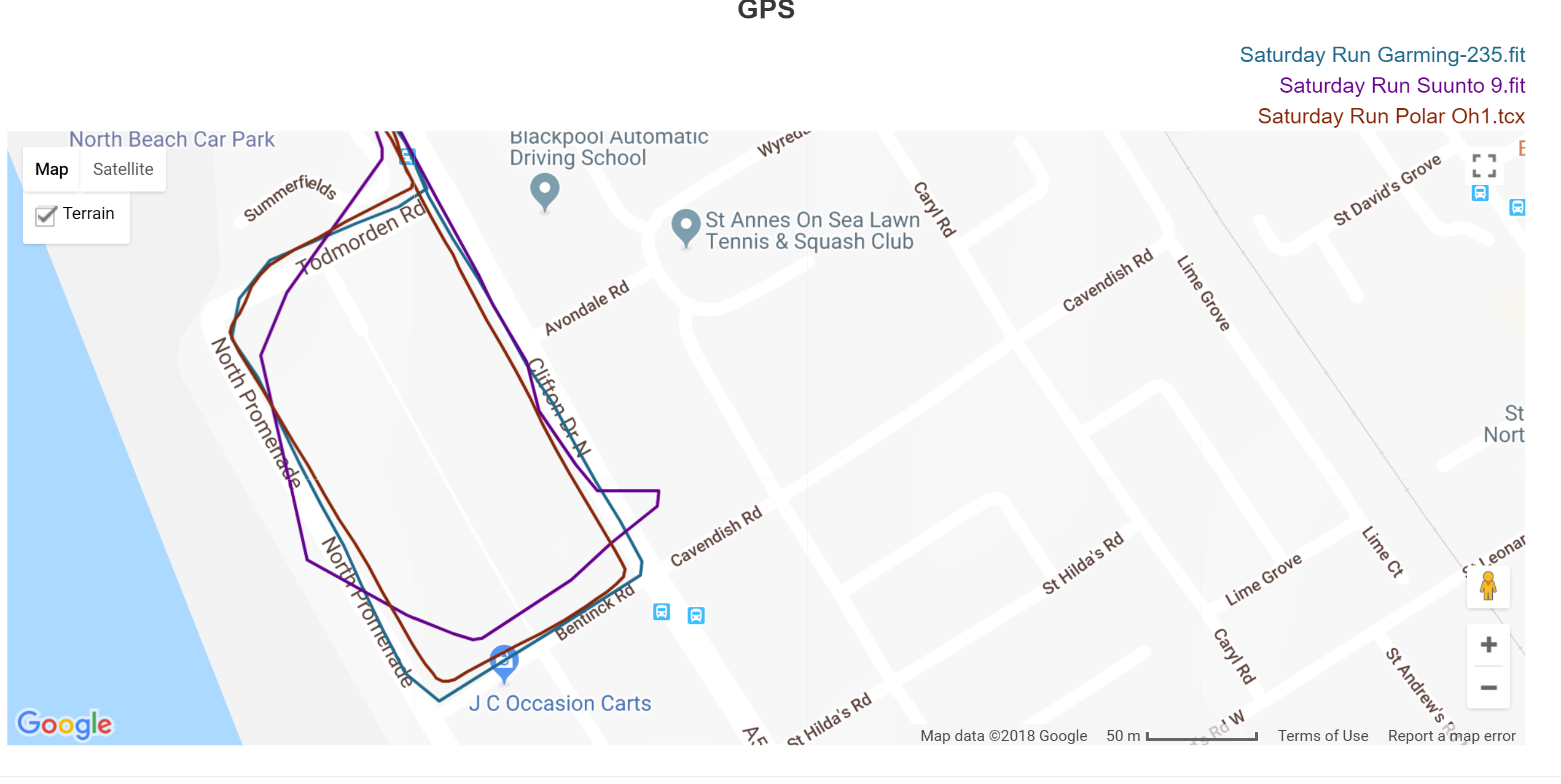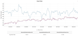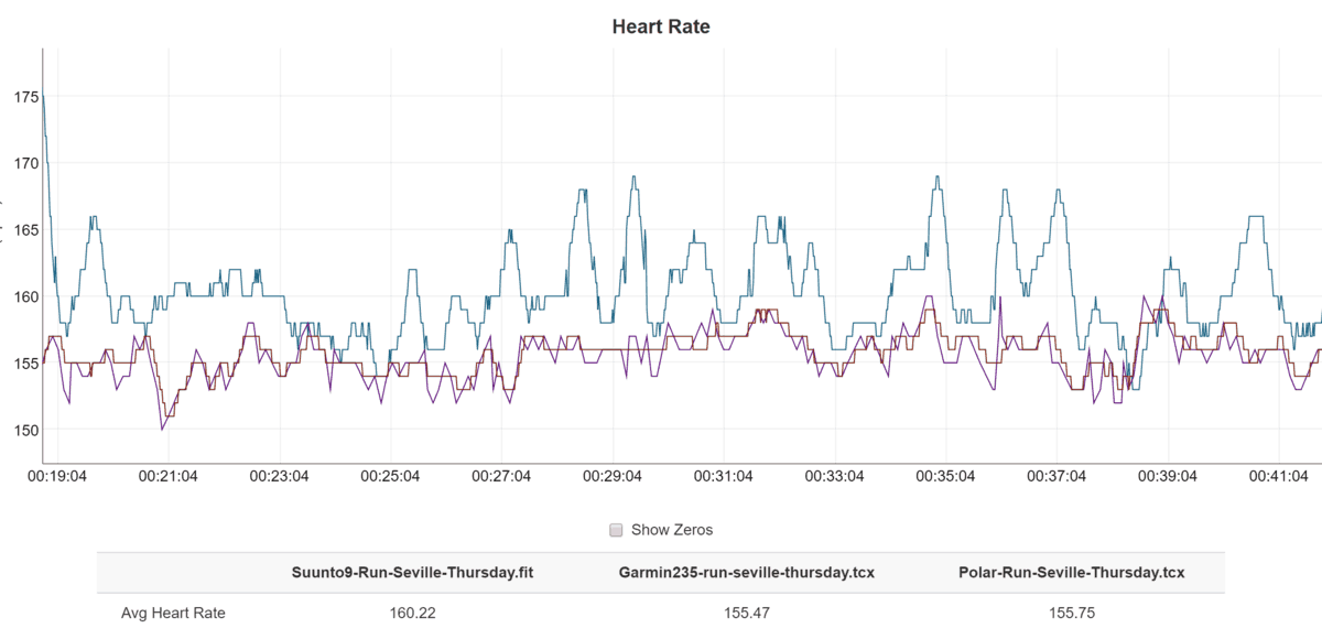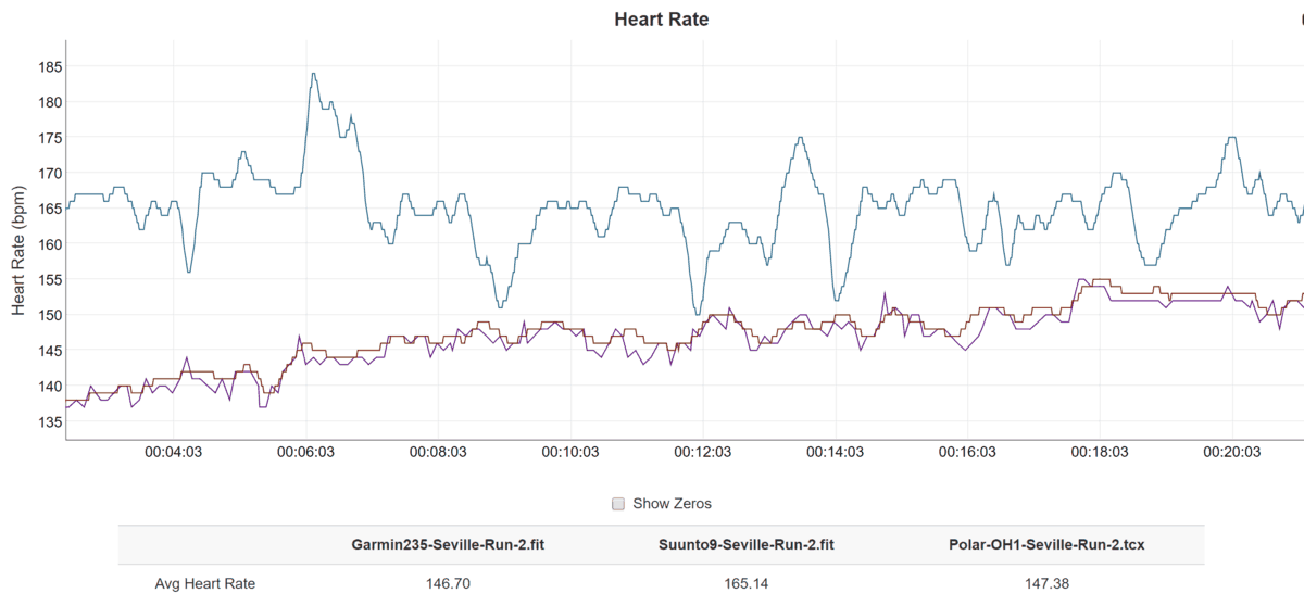 This particular run was a good example of the issues you can experience with wrist-based heart rate tracking, I had issues with the Suunto the first 20 mins, but once the fit was fixed it tracked quite accurately against the Polar. With the Garmin, even though I was wearing it quite tightly, it just completely failed for the entire run.