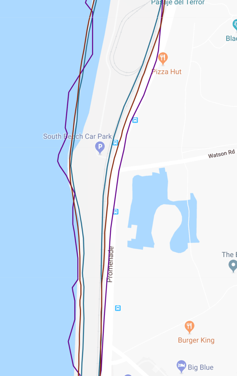 On the same run, I also put the watch into endurance mode to see how well the watch performs with its slower GPS sampling. It was mostly a straight route, so not the best to plot a GPS track, but I found it works well, but naturally not as good as the 1-second sampling on the normal mode. By the end of the route, the watch had tracked 13.47 miles or 21.68 km while the Garmin and my phone tracked 12.69 miles or 20.42km. While it was mainly a straight route, there was a sharp 90-degree turn at the start and a 180-half way around, so it is possible these were the points where it miss-tracked the distance. This is not ideal for short quick sessions, but if you are on a 6-hour bike ride, I don’t think less than 1 mile over reporting is a significant issue. You can see the issues with pacing below: